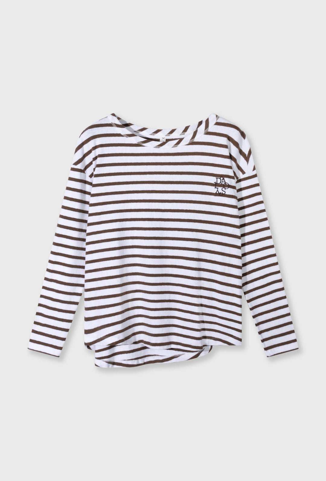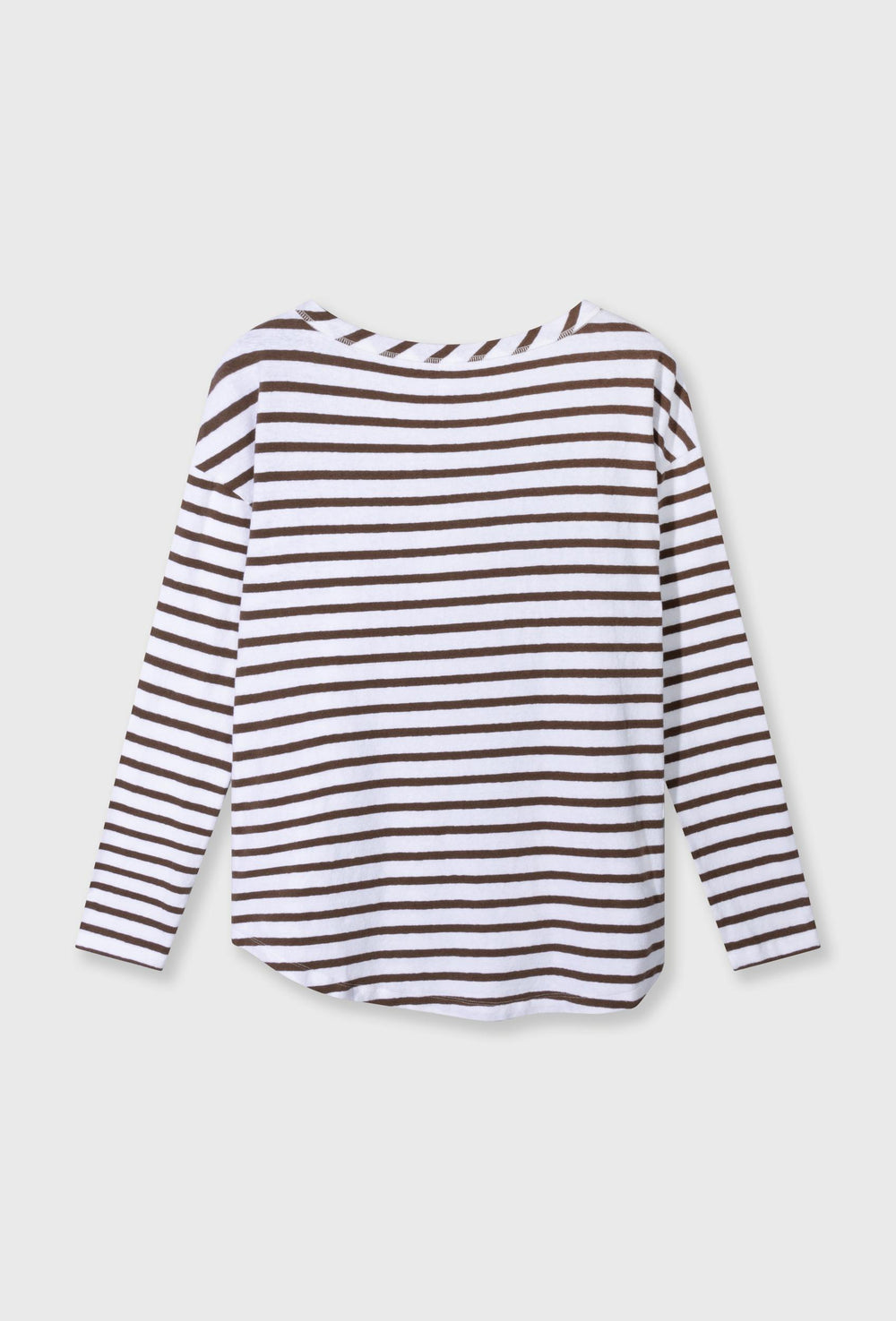 Brązowo-biała bluzka w paski z długim rękawem i haftowanym logo