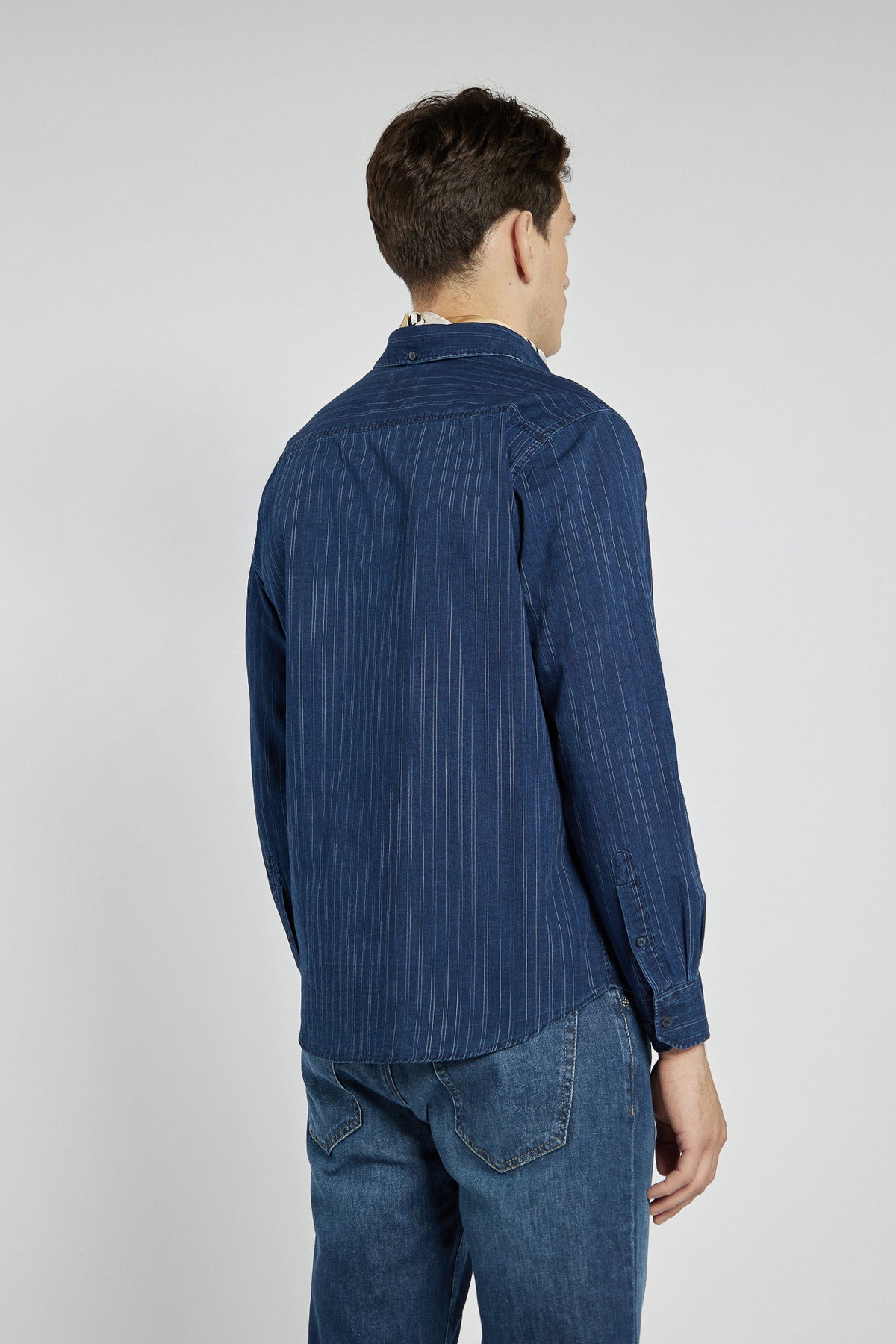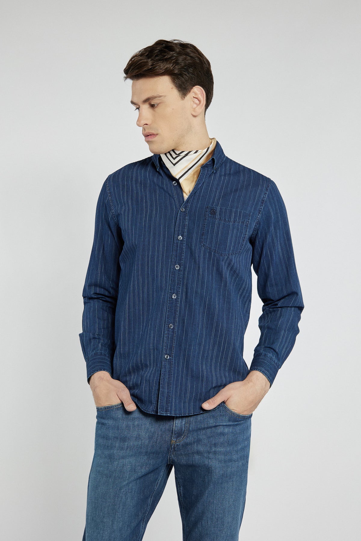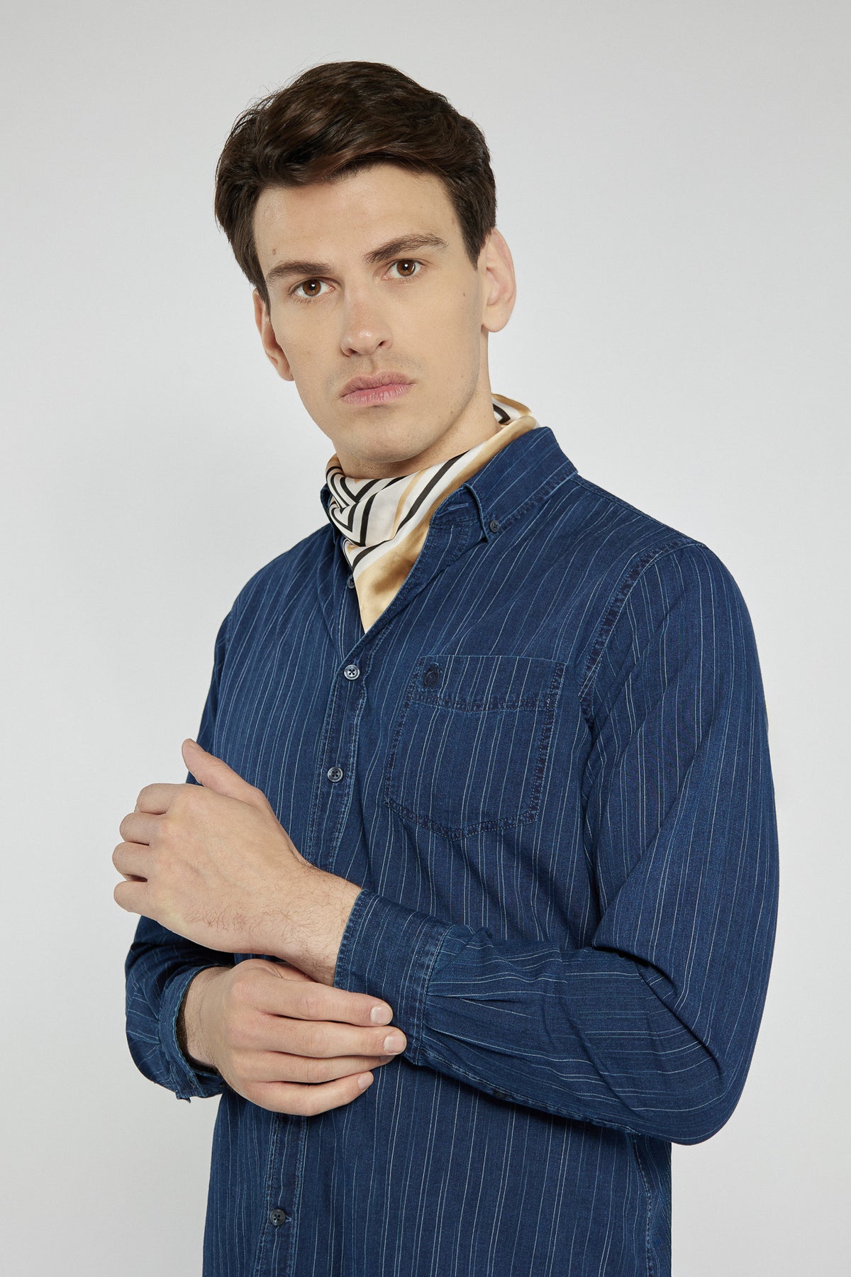 Męska koszula Campione w fasonie Modern Fit, w eleganckie granatowe paski, to uniwersalny element męskiej garderoby. Wykonana z wysokiej jakości materiału, zapewnia komfort noszenia i doskonałe dopasowanie. Koszula posiada długi rękaw z mankietami na guziki oraz klasyczny kołnierzyk, co sprawia, że jest idealna zarówno do stylizacji biznesowych, jak i casualowych. Wzór w paski optycznie wydłuża sylwetkę, dodając elegancji i nowoczesności.