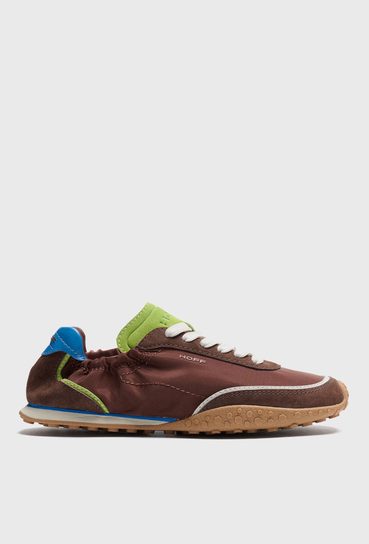 Ten model to stylowe połączenie głębokiego brązu z neonowym, limonkowym akcentem na języku oraz intensywnym błękitem na pięcie. Smukła sylwetka podkreślona białą lamówką i jasnymi sznurowadłami nadaje butom sportowej elegancji w wydaniu premium. Elastyczna cholewka osadzona na karmelowej podeszwie z wypustkami gwarantuje unikalny wygląd i wygodę użytkowania.