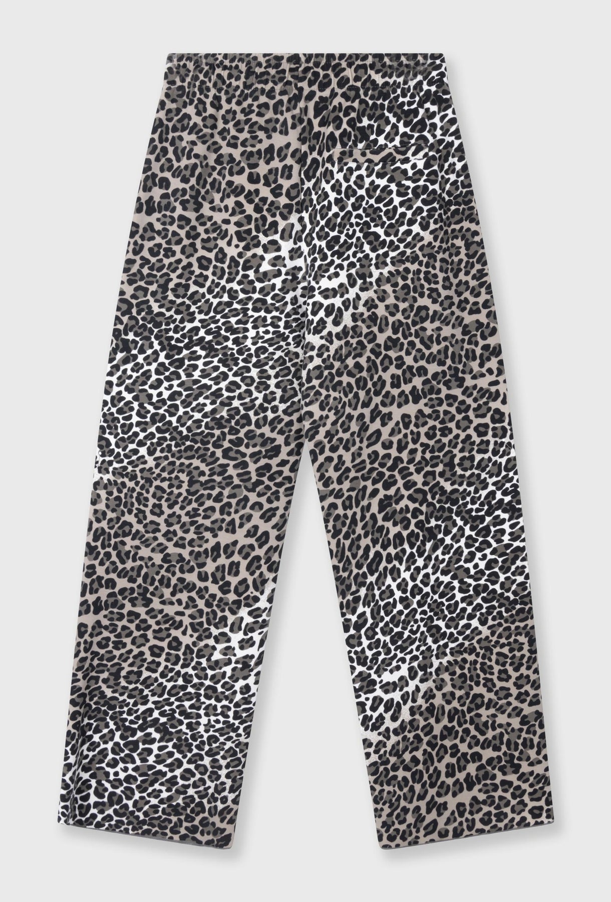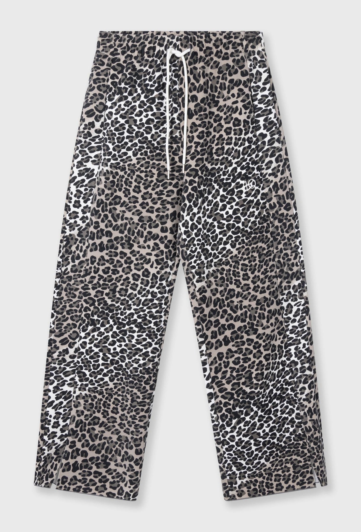 Wyraziste spodnie o luźnym kroju wide leg, które łączą komfort noszenia z modnym, zwierzęcym printem. Wykonane z lekkiej, miękkiej dzianiny, doskonale układają się na sylwetce i zapewniają swobodę ruchów. Elastyczna talia z regulowanym troczkiem umożliwia indywidualne dopasowanie i podkreśla casualowy charakter modelu. Subtelne rozcięcia u dołu nogawek dodają lekkości i nowoczesnego akcentu, a minimalistyczny haft z logo z przodu stanowi dyskretny detal brandingowy. Spodnie posiadają praktyczne kieszenie boczne oraz tylną kieszeń. Idealne do stylizacji typu total look z dopasowaną górą lub jako mocny akcent w codziennych, miejskich zestawach.