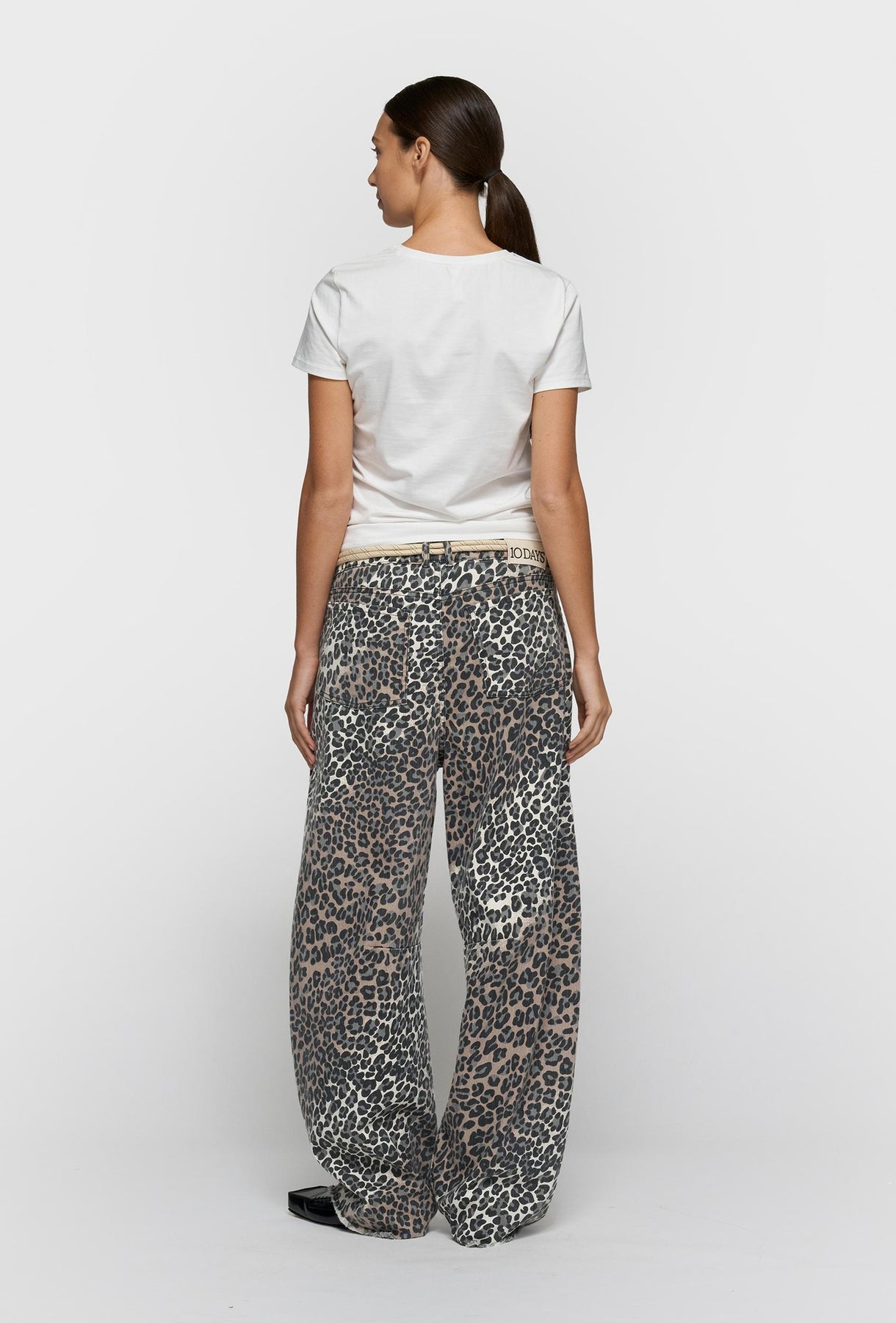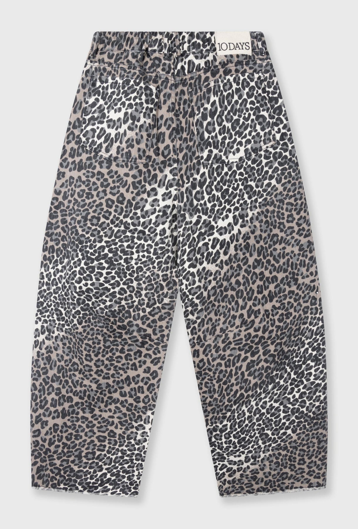 Wyraziste spodnie o luźnym kroju wide leg, które przyciągają uwagę modnym, animalistycznym printem. Wykonane z miękkiej, przyjemnej w dotyku tkaniny, zapewniają komfort noszenia oraz swobodę ruchów przez cały dzień. Klasyczna talia z zapięciem i elastycznym wykończeniem z tyłu gwarantuje dobre dopasowanie i wygodę. Szerokie nogawki nadają sylwetce lekkości i nowoczesnego charakteru, a całość świetnie układa się w ruchu. Spodnie wyposażone są w praktyczne kieszenie boczne oraz tylne, a subtelny haft z logo na nogawce stanowi dyskretny akcent brandingowy. Idealne do codziennych i miejskich stylizacji – doskonale sprawdzą się zarówno w zestawieniu z prostym topem lub T-shirtem, jak i z oversize’ową bluzą czy marynarką, tworząc modny, zdecydowany look.
