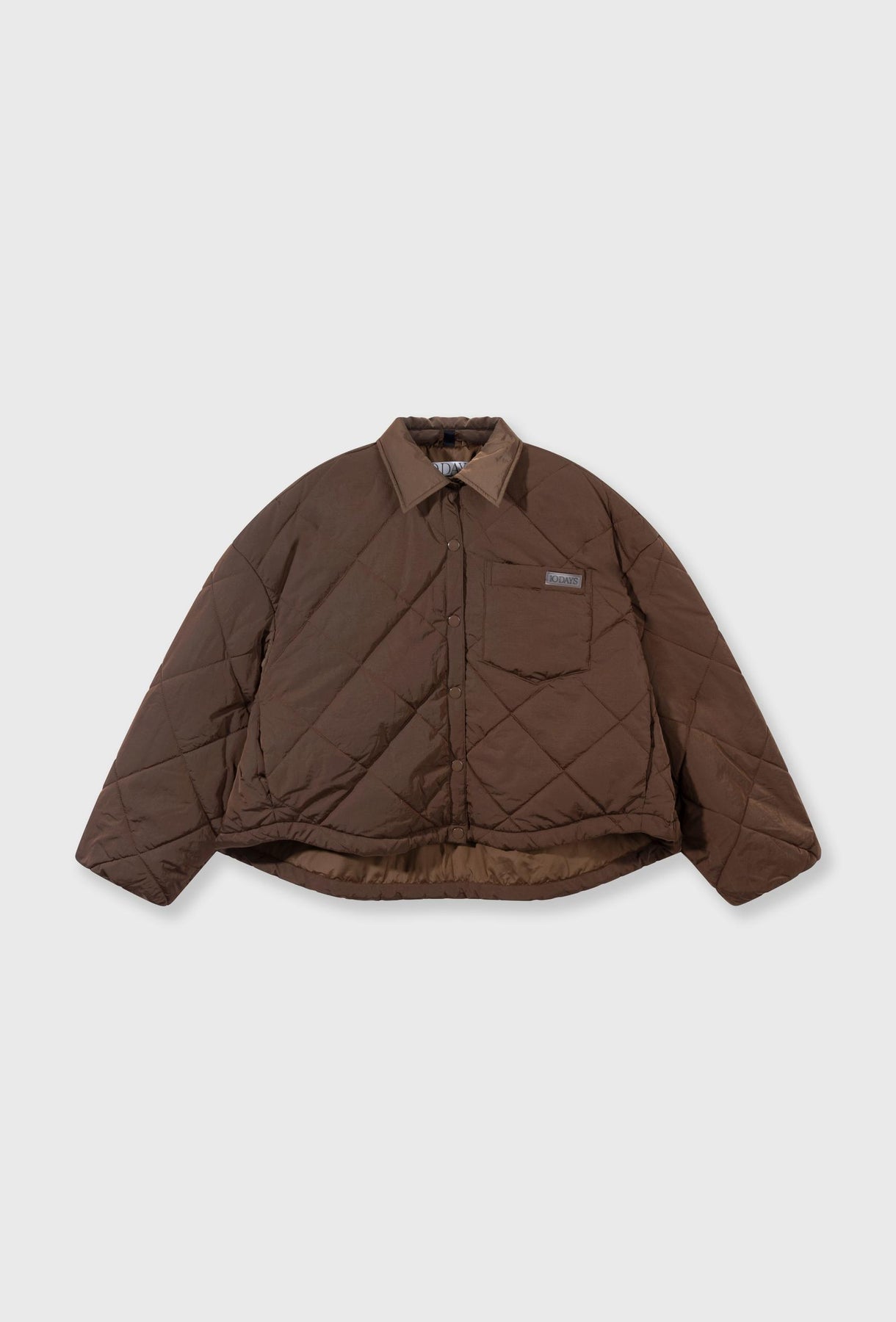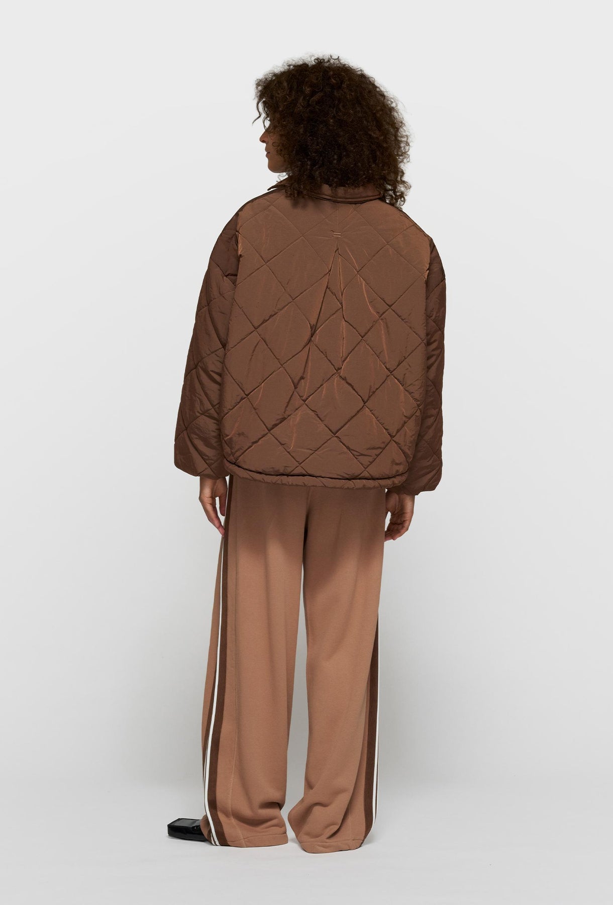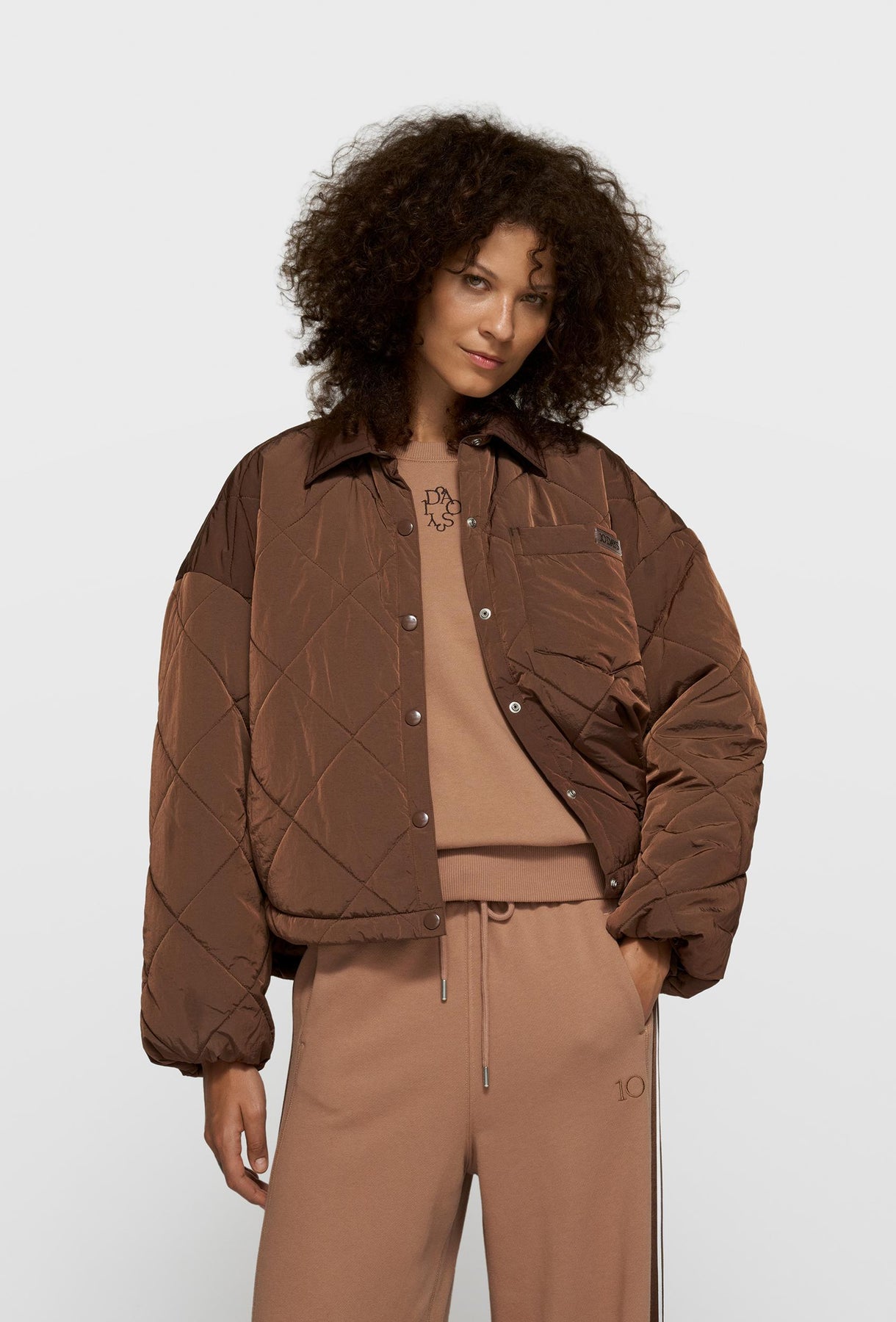 Nowoczesna, krótka kurtka typu quilted (pikowana), łącząca luźny, sportowy fason bomberki z eleganckimi detalami. Model ma modny, oversizowy krój o skróconej długości, który doskonale sprawdzi się w warstwowych stylizacjach. Charakterystyczne pikowanie w romby nadaje kurtce klasycznego, a zarazem swobodnego charakteru. Wykonana z lekko błyszczącego, brązowego (czekoladowego) materiału, który subtelnie zmienia odcień w zależności od światła. Kurtka posiada klasyczny kołnierz koszulowy, zapięcie na napy i praktyczną naszywkę z logo na wysokości piersi. Dół kurtki jest regulowany za pomocą ściągacza, co pozwala na zmianę sylwetki – od luźnej po bardziej zbluzowaną. Jest to idealny wybór na przejściowe pory roku. Doskonale komponuje się z dresowymi spodniami i topem, tworząc wygodny, ale stylowy total look w odcieniach nude, a także świetnie pasuje do jeansów lub spódnic.