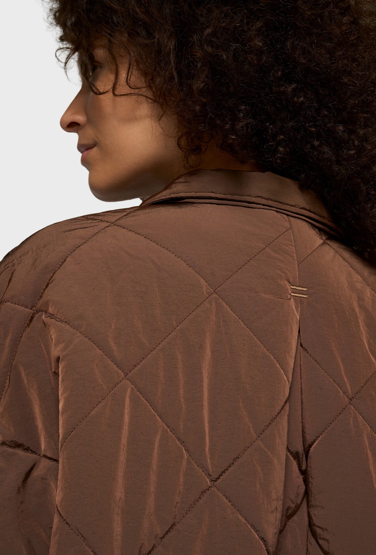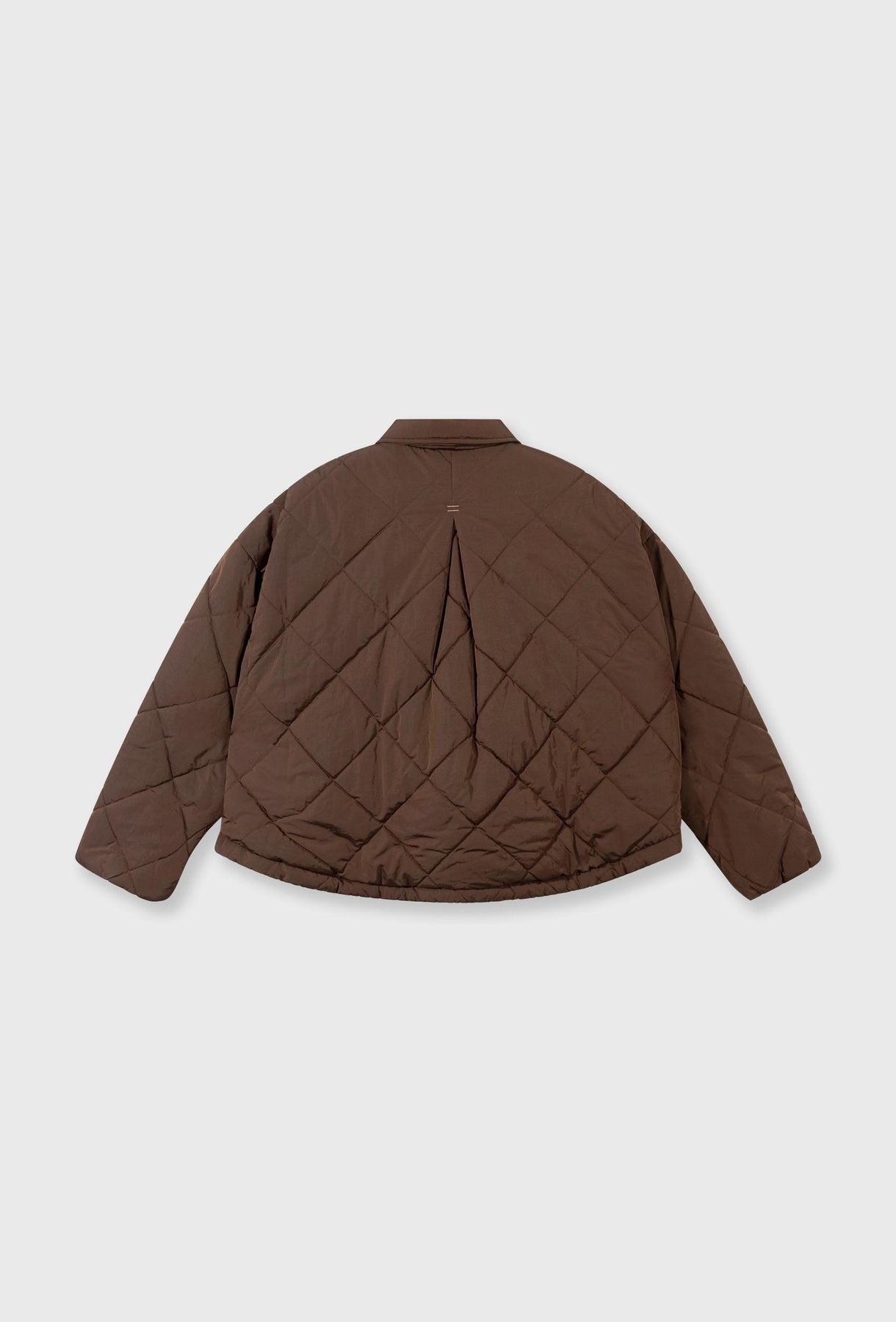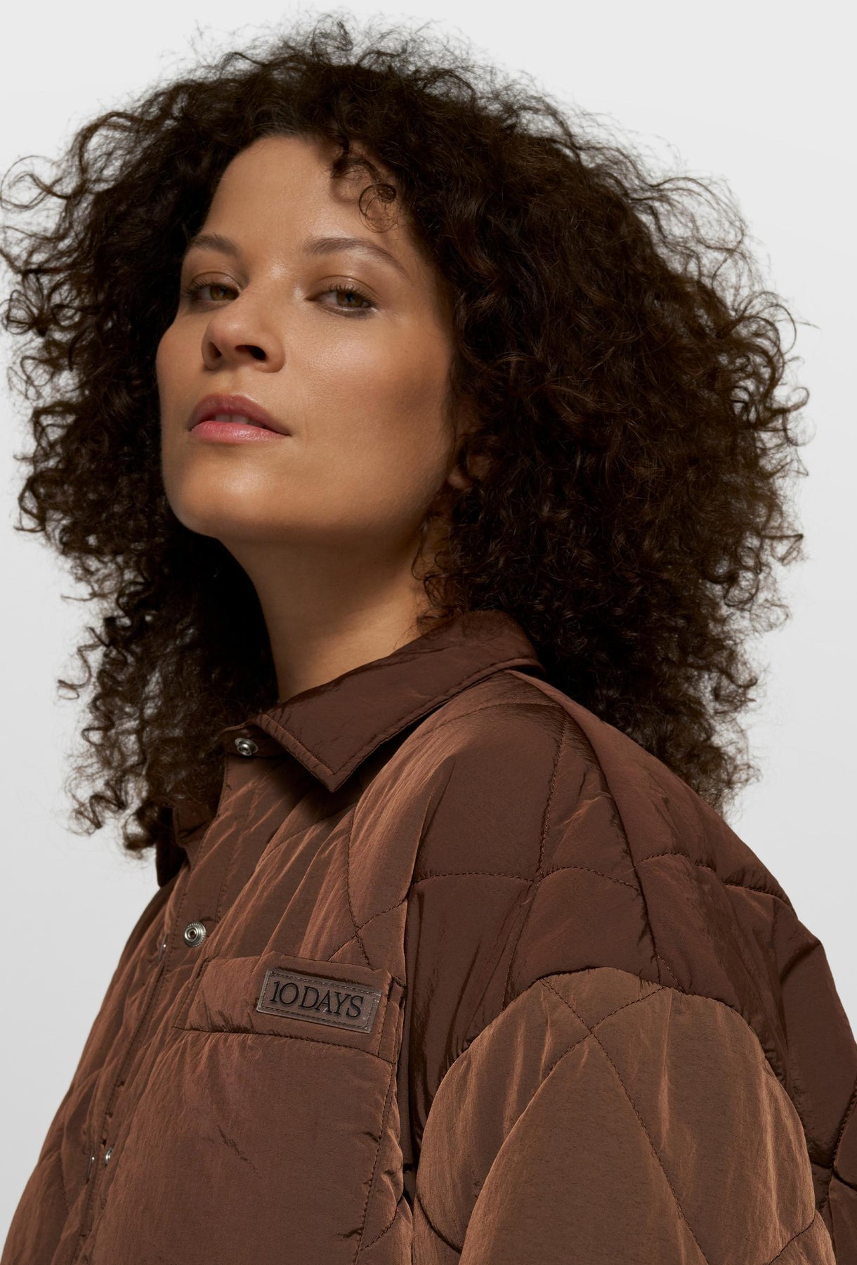 Nowoczesna, krótka kurtka typu quilted (pikowana), łącząca luźny, sportowy fason bomberki z eleganckimi detalami. Model ma modny, oversizowy krój o skróconej długości, który doskonale sprawdzi się w warstwowych stylizacjach. Charakterystyczne pikowanie w romby nadaje kurtce klasycznego, a zarazem swobodnego charakteru. Wykonana z lekko błyszczącego, brązowego (czekoladowego) materiału, który subtelnie zmienia odcień w zależności od światła. Kurtka posiada klasyczny kołnierz koszulowy, zapięcie na napy i praktyczną naszywkę z logo na wysokości piersi. Dół kurtki jest regulowany za pomocą ściągacza, co pozwala na zmianę sylwetki – od luźnej po bardziej zbluzowaną. Jest to idealny wybór na przejściowe pory roku. Doskonale komponuje się z dresowymi spodniami i topem, tworząc wygodny, ale stylowy total look w odcieniach nude, a także świetnie pasuje do jeansów lub spódnic.