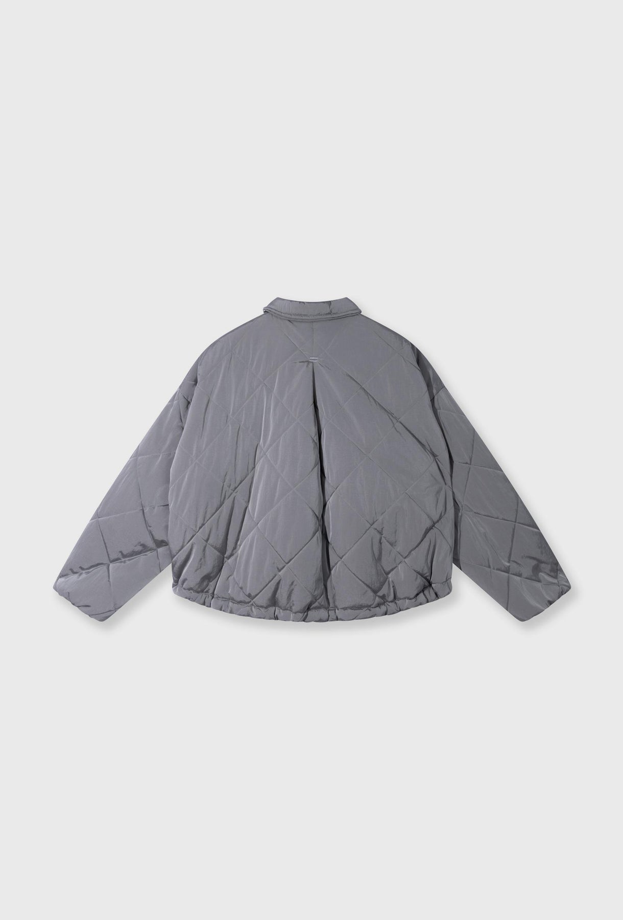 Nowoczesna, krótka kurtka typu quilted (pikowana), łącząca luźny, sportowy fason bomberki z eleganckimi detalami. Model ma modny, oversizowy krój o skróconej długości, który doskonale sprawdzi się w warstwowych stylizacjach. Charakterystyczne pikowanie w romby nadaje kurtce struktury i swobodnego charakteru. Wykonana z lśniącego, metalicznie szarego materiału, który dynamicznie odbija światło, nadając stylizacji futurystycznego, ale subtelnego blasku. Kurtka posiada klasyczny kołnierz koszulowy, zapięcie na napy oraz praktyczną kieszonkę na piersi ozdobioną naszywką z logo. Dzięki regulowanemu dołowi możliwe jest dopasowanie fasonu do sylwetki lub podkreślenie talii za pomocą paska. Jest to idealny wybór na przejściowe pory roku. Doskonale komponuje się z elementami w odcieniach szarości i beżu, tworząc modny monochromatyczny total look, a także świetnie sprawdza się jako kontrastowy element do czerni lub bieli.