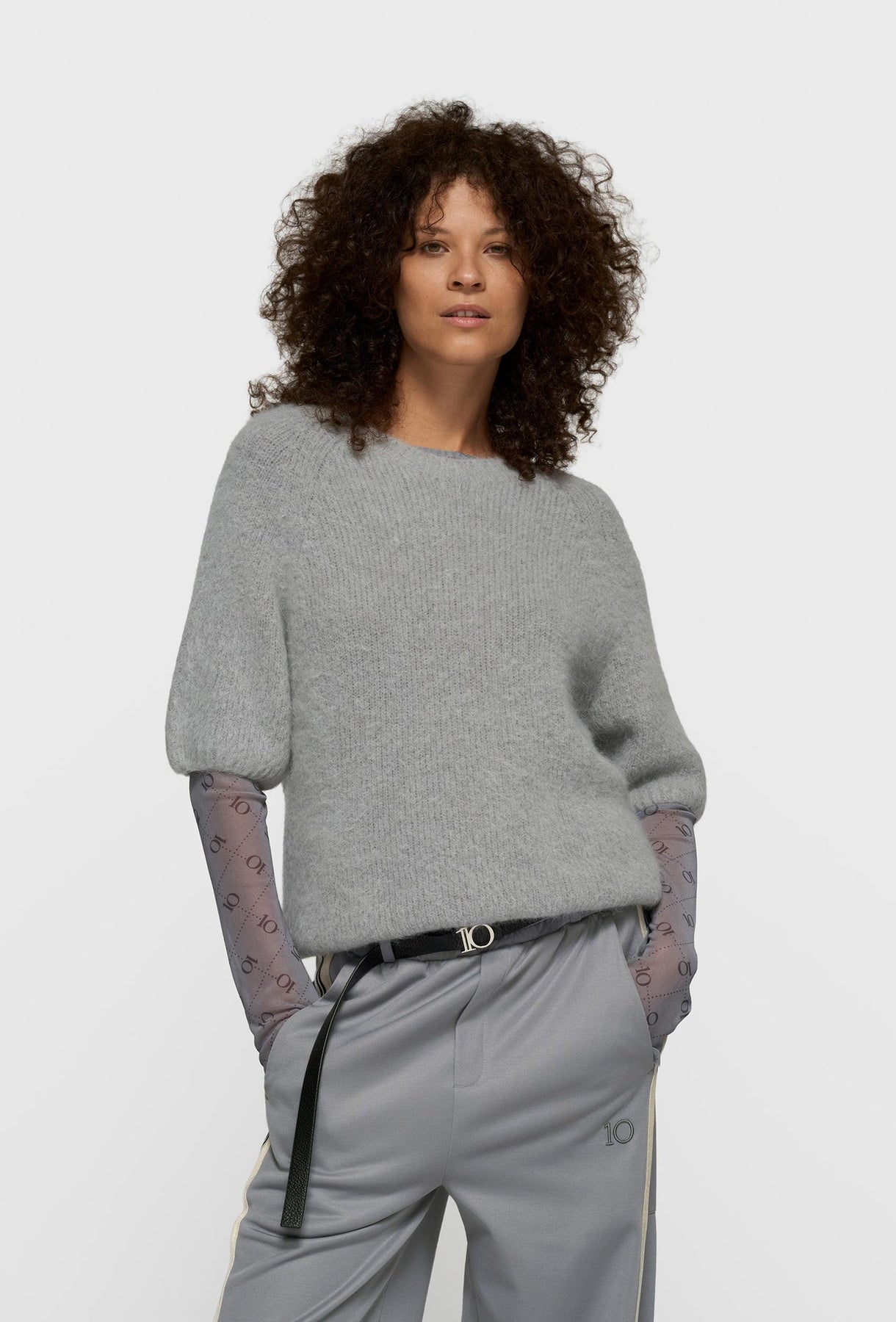 Wyjątkowy sweter o luźnym, pudełkowym kroju z nietypowym, krótkim rękawem, idealny do noszenia solo lub w zestawach warstwowych. Posiada klasyczny, okrągły dekolt. Wykonany z miękkiej i puszystej dzianiny, co zapewnia ciepło i przyjemny w dotyku materiał. Kolor jasnoszary jest uniwersalny i świetnie łączy się z innymi elementami garderoby. Subtelny, okrągły haft z logo umieszczony z tyłu na karku dodaje dyskretnej jakości. Sweter doskonale sprawdza się w zestawieniach casualowych, a zestawiony z szerokimi, szarymi spodniami tworzy harmonijny i komfortowy look.