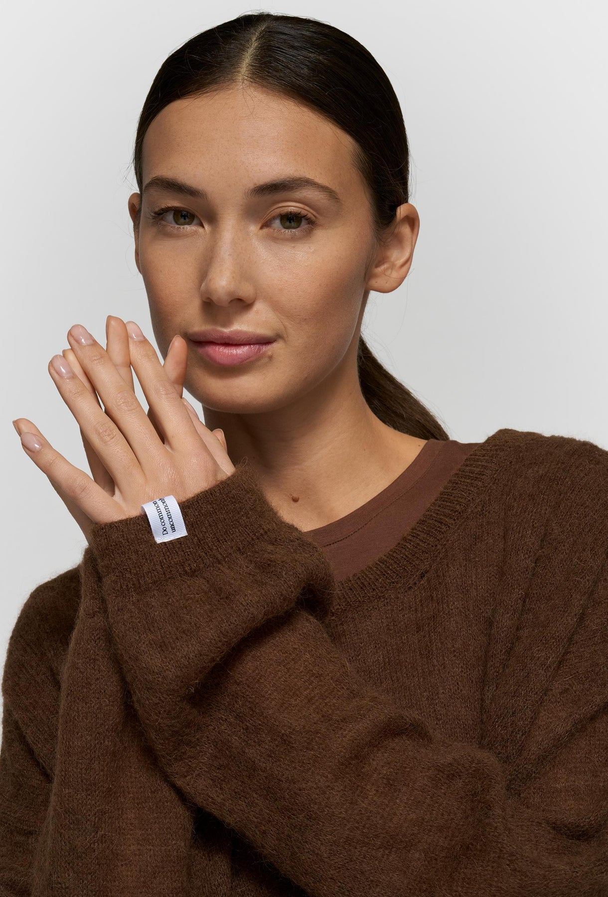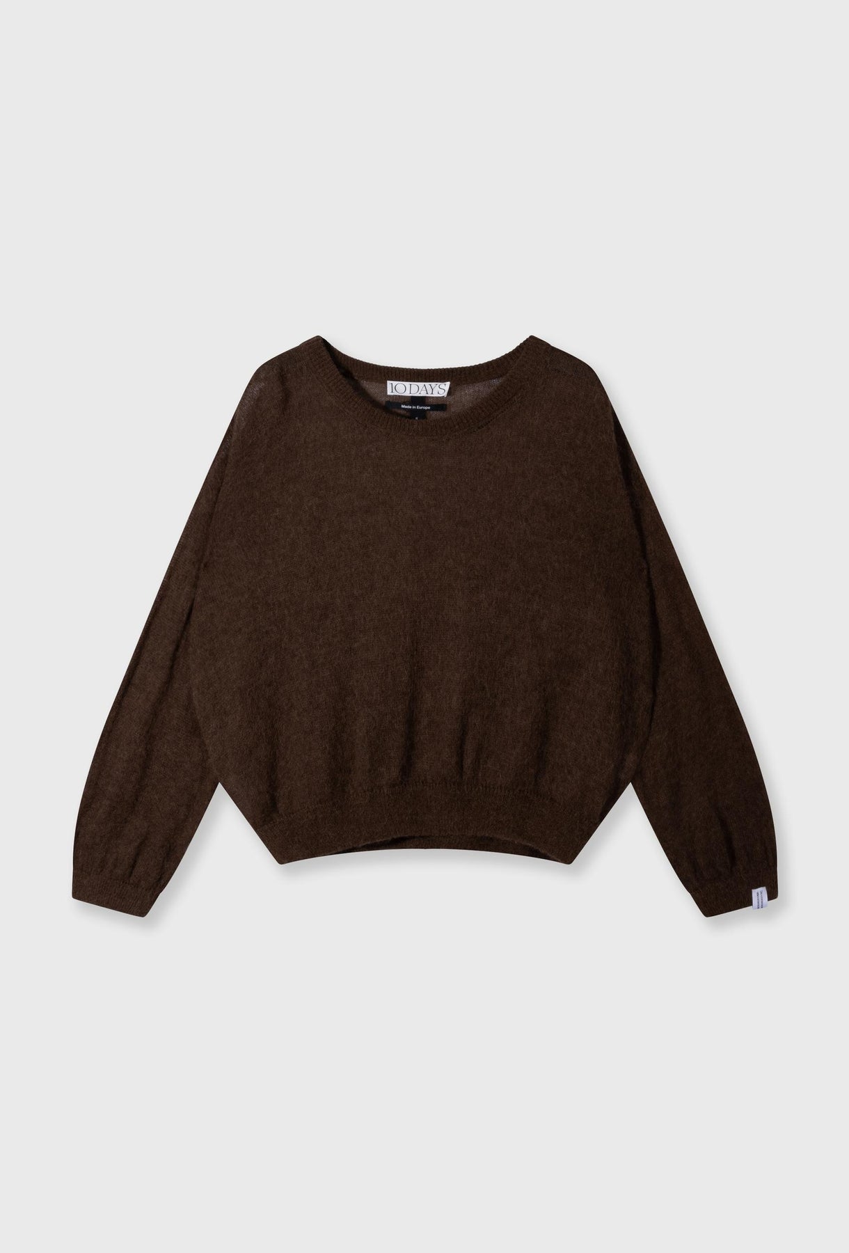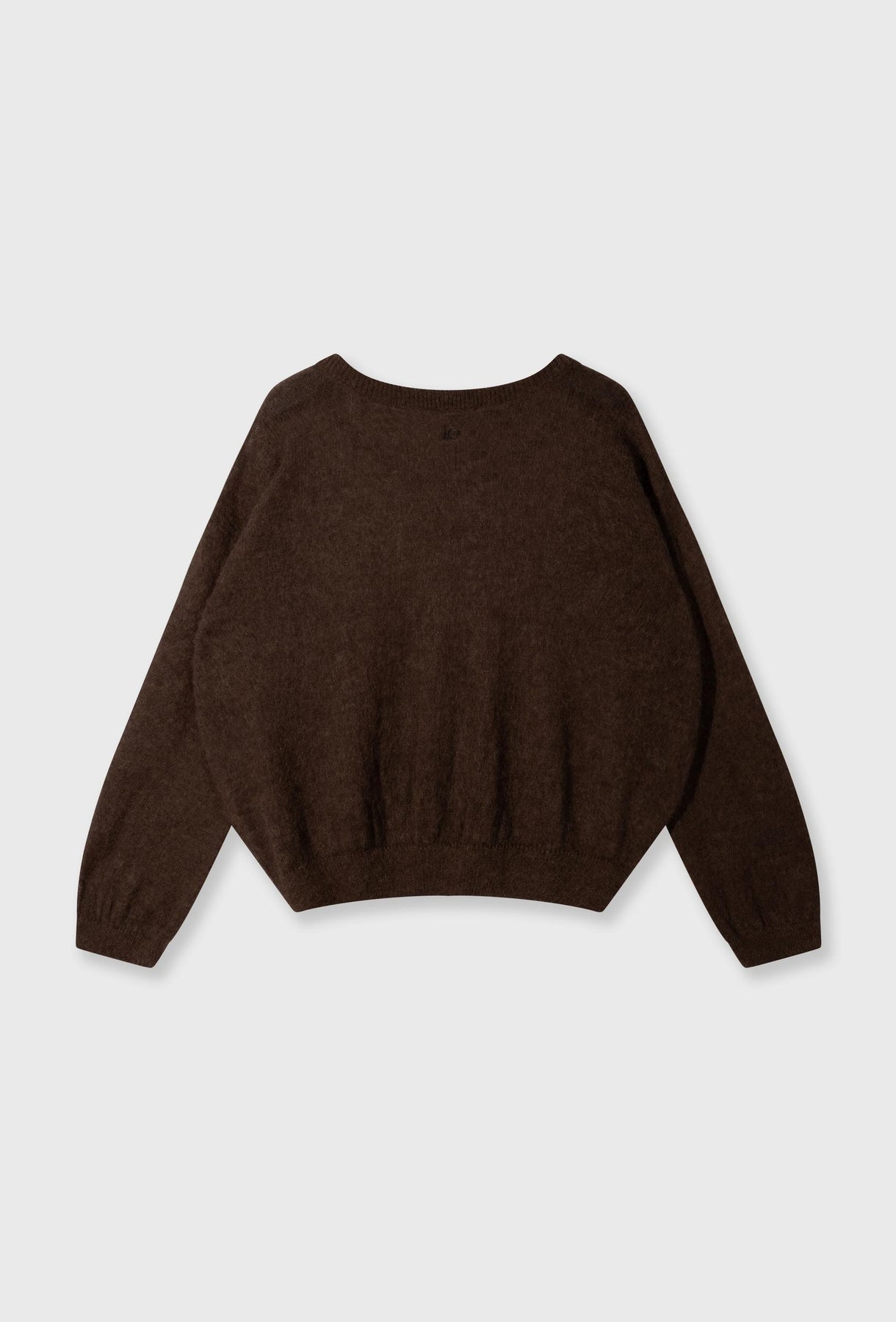 Lekki sweter wykonany z delikatnej, puszystej dzianiny w głębokim, czekoladowym odcieniu brązu, zapewnia wyjątkowy komfort cieplny i miękkość noszenia. Jego struktura jest lekko prześwitująca, co dodaje mu subtelnej tekstury i głębi. Sweter charakteryzuje się luźnym, obniżonym krojem typu oversize oraz klasycznym, okrągłym dekoltem (crewneck), idealnym do noszenia na T-shirt lub gładki top. Na jednym mankiecie widoczna jest mała, biała wszywka stanowiąca dyskretny, ale charakterystyczny detal. Ten sweter to idealny wybór, aby dodać tekstury i ciepła do stylizacji. Świetnie sprawdzi się zarówno w połączeniu z dopasowanymi spodniami dresowymi, tworząc monochromatyczny, casualowy zestaw, jak i z eleganckimi spódnicami czy jeansami, stanowiąc przytulne i modne dopełnienie.