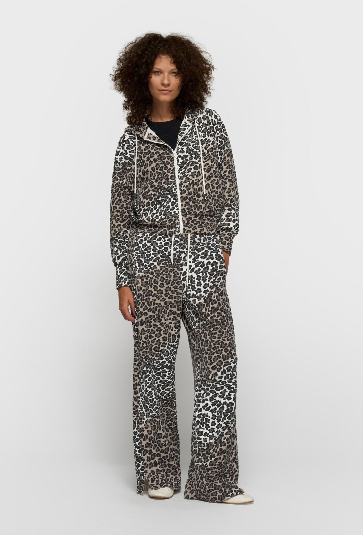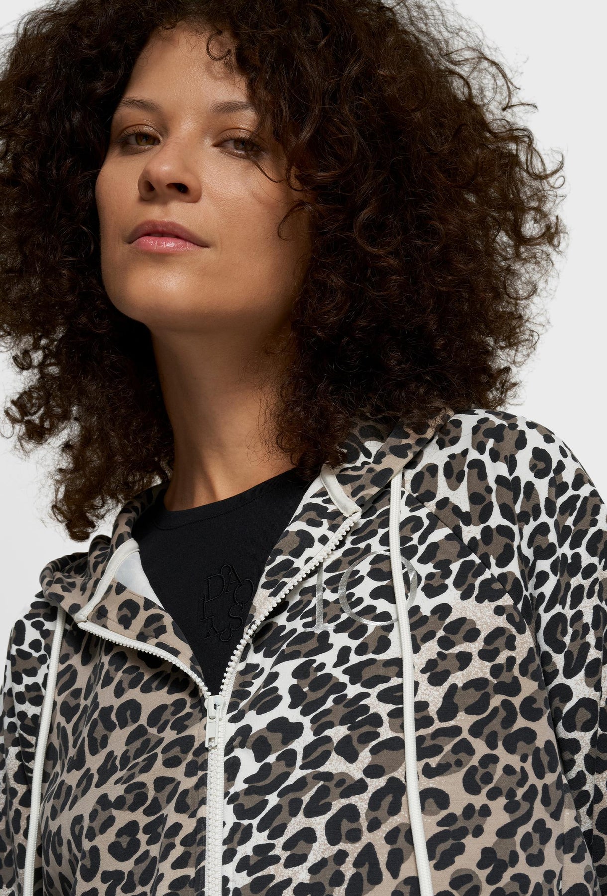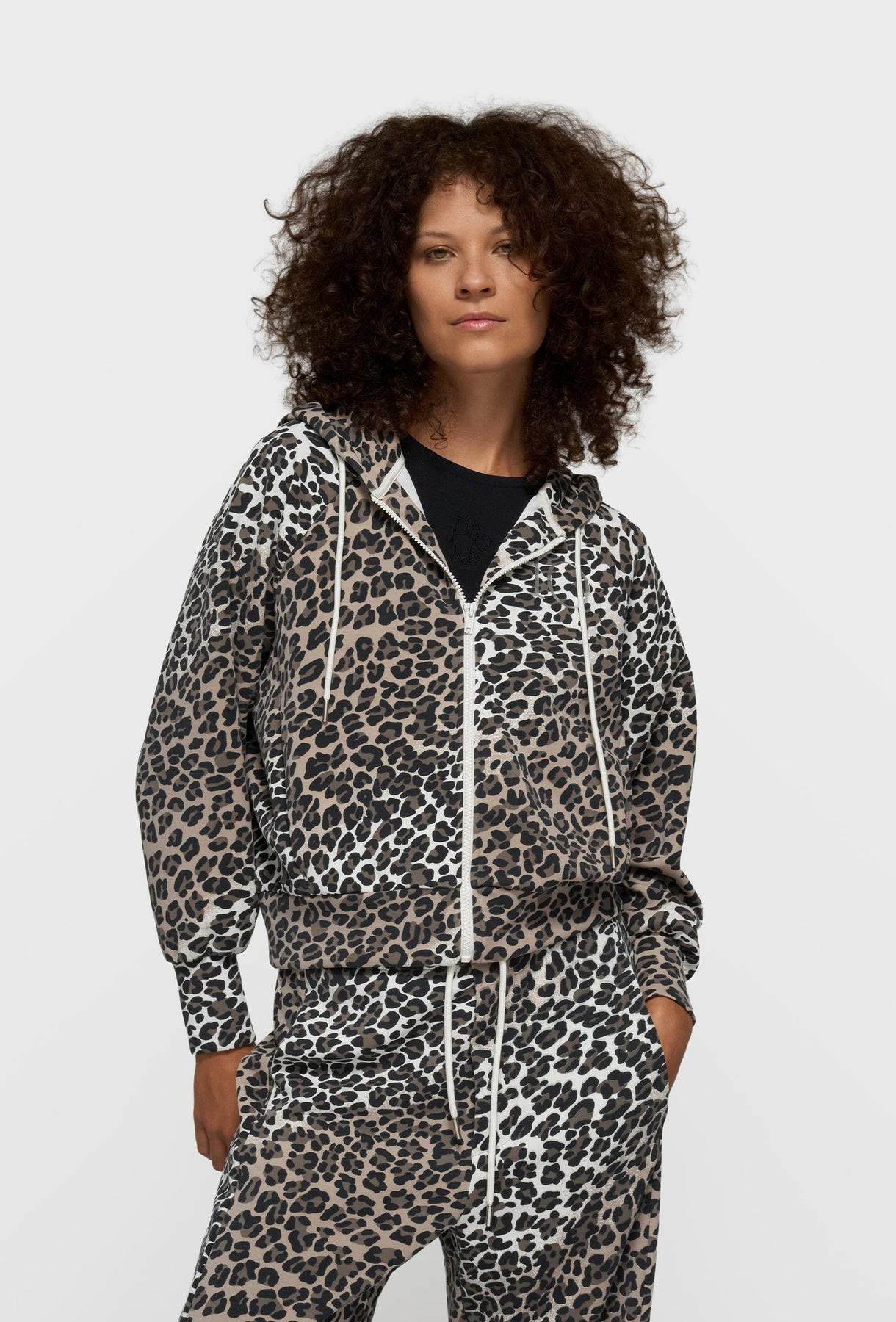 Efektowna bluza z kapturem o swobodnym, casualowym charakterze, która łączy wygodę noszenia z wyrazistym designem. Model zapinany na zamek błyskawiczny, z klasycznym kapturem regulowanym kontrastowymi troczkami, doskonale sprawdzi się w codziennych stylizacjach. Dynamiczny, panterkowy wzór nadaje całości modowego, nowoczesnego wyrazu, a kieszenie boczne zwiększają funkcjonalność i komfort użytkowania. Bluza została wykonana z miękkiej, przyjemnej w dotyku dzianiny, zapewniającej wygodę przez cały dzień. Idealna do noszenia zarówno w komplecie ze spodniami o tym samym princie, jak i jako wyrazisty element przełamujący minimalistyczne stylizacje miejskie lub sportowe.
