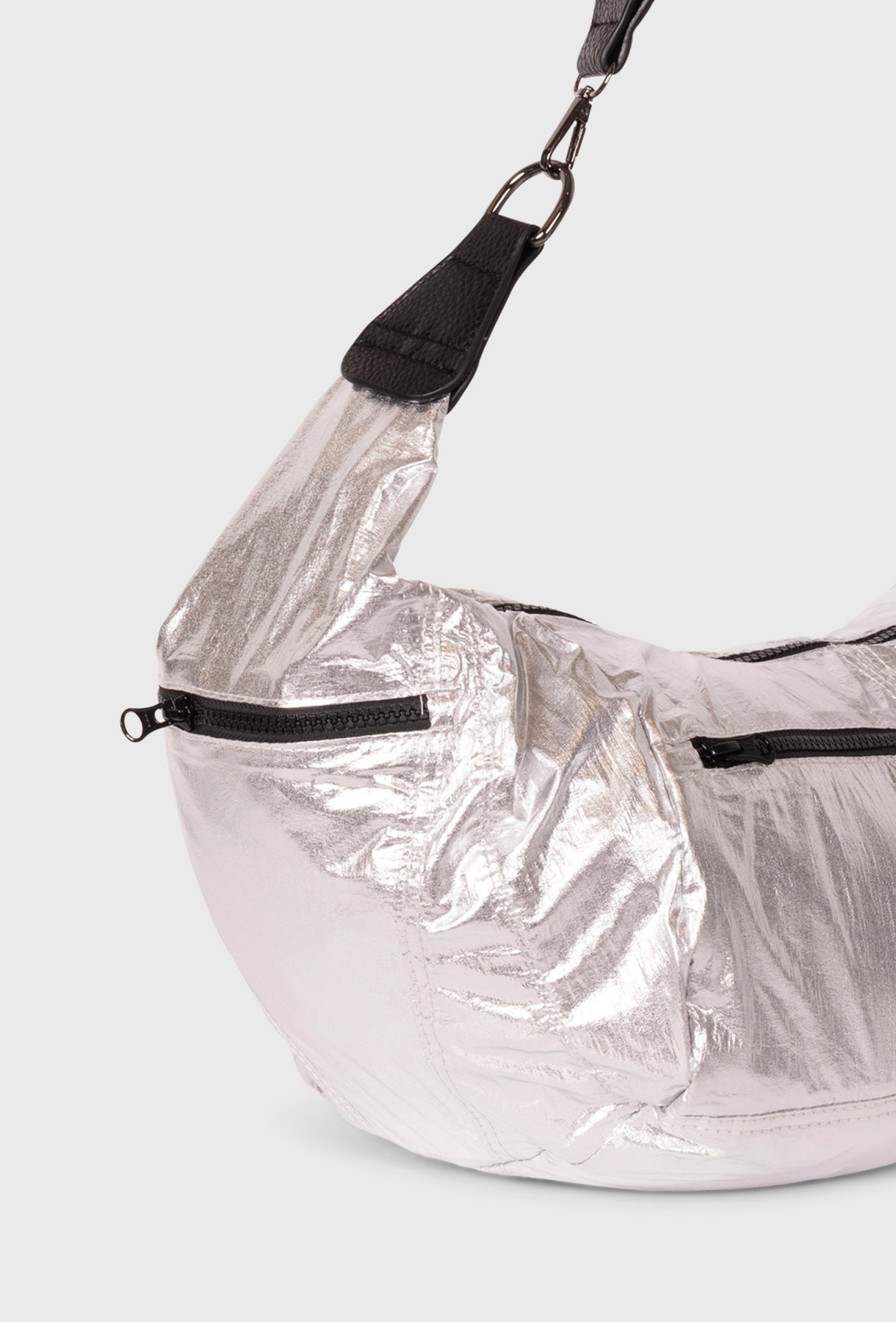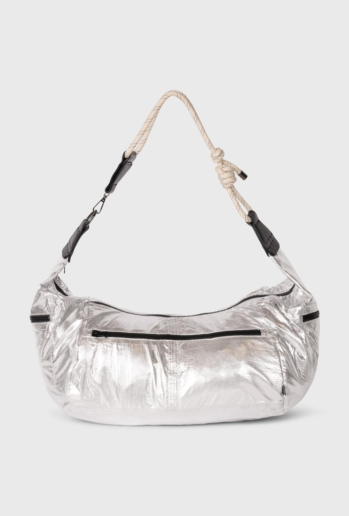 Klasyczna torba na ramię o zaokrąglonym kształcie typu hobo lub moon bag, wzbogacona nowoczesnym, wyrazistym materiałem. Model wykonany z połyskującego, metalicznego materiału w kolorze srebrnym, który nadaje całości kosmiczny, nowoczesny charakter i przyciąga wzrok. Torba posiada przestronną, miękką formę i jest zapinana na czarny zamek błyskawiczny. Funkcjonalność zwiększa dodatkowa zewnętrzna kieszeń na zamek, idealna na drobiazgi. Charakterystycznym elementem jest uchwyt wykonany z grubej, plecionej liny w kolorze écru, który jest związany na supeł i zakończony czarnymi elementami regulacyjnymi. Uchwyt ten nadaje torbie sportowo-żeglarskiego lub outdoorowego charakteru, tworząc ciekawy kontrast z futurystycznym srebrem. Dzięki możliwości noszenia na ramieniu lub na ukos (crossbody), torba doskonale uzupełnia zarówno casualowe, jak i bardziej awangardowe stylizacje, stanowiąc stylowy i odważny akcent codziennych zestawów.