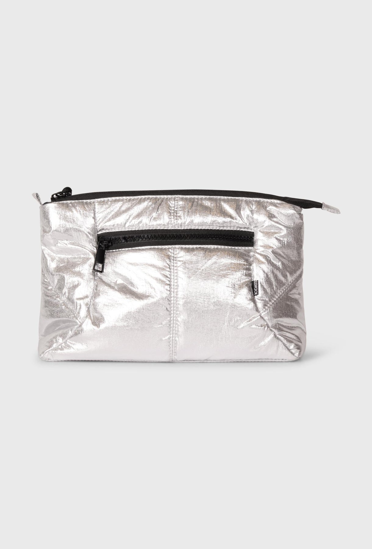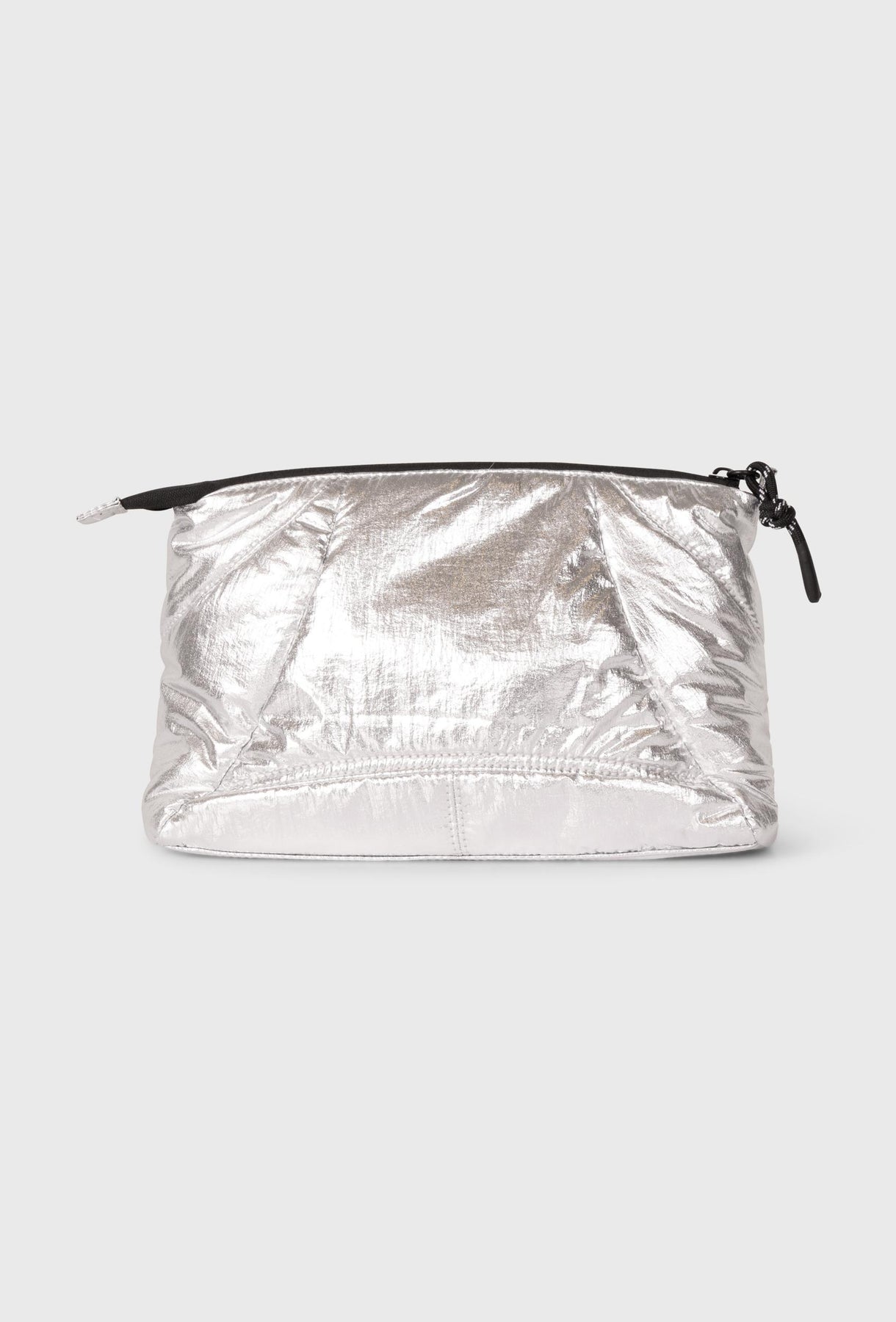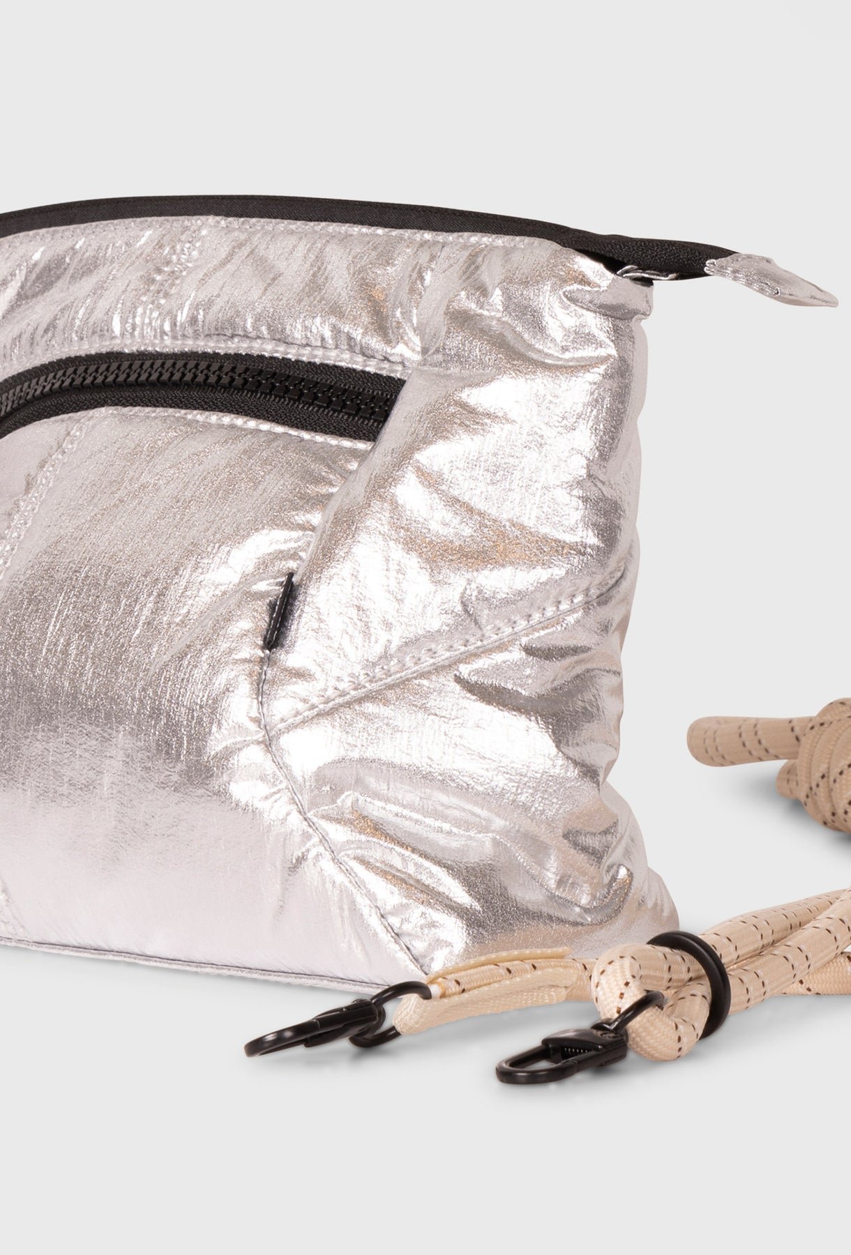 Elegancka i nowoczesna mała torebka o kompaktowej formie, idealna, by dodać futurystycznego blasku każdej stylizacji. Model wykonany z połyskującego, metalicznego materiału w kolorze srebrnym, który nadaje całości luksusowy i odważny charakter. Torebka charakteryzuje się pikowaną, miękką strukturą, która podkreśla jej objętość i miękkość. Jest zapinana na czarny zamek błyskawiczny, który stanowi kontrastowy, graficzny element wykończenia. Z przodu znajduje się dodatkowa kieszeń na zamek, zwiększająca jej funkcjonalność. Do saszetki dołączony jest cienki, pleciony pasek linowy w kolorze écru, który umożliwia noszenie jej na ramieniu lub na ukos (crossbody), co zapewnia wygodę i swobodę ruchu. Ten nietypowy pasek nadaje torebce sportowego, casualowego charakteru, przełamując elegancję metalicznego materiału. Dzięki swojemu rozmiarowi, torebka doskonale sprawdzi się na niezbędne drobiazgi. Stanowi stylowy i wyrazisty akcent, który świetnie uzupełni zarówno minimalistyczne, jak i wzorzyste zestawy.