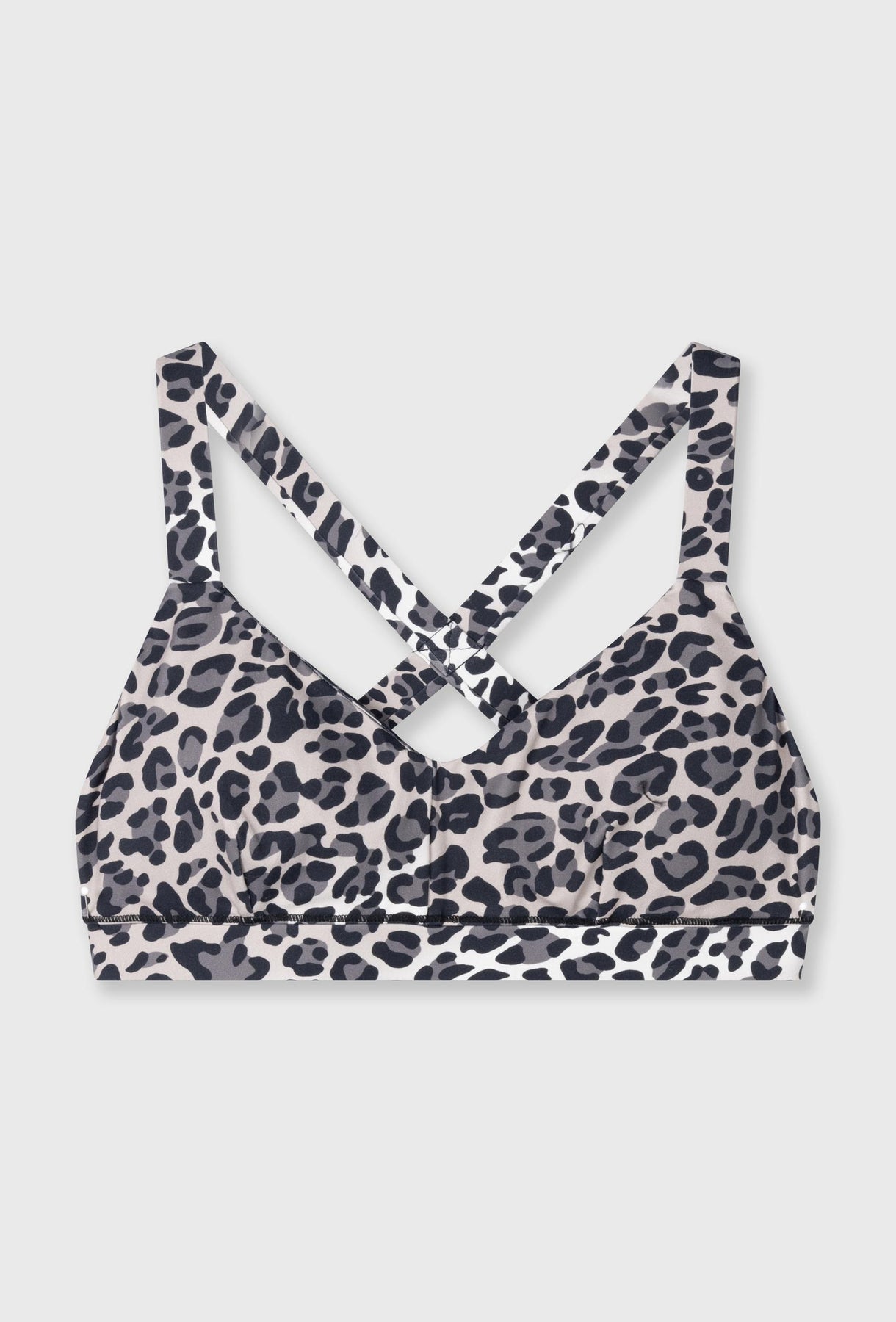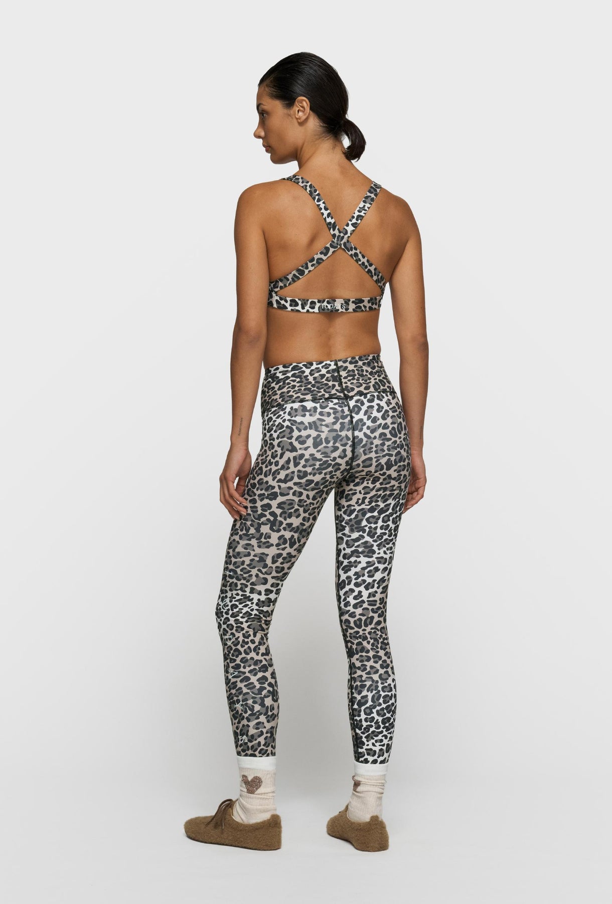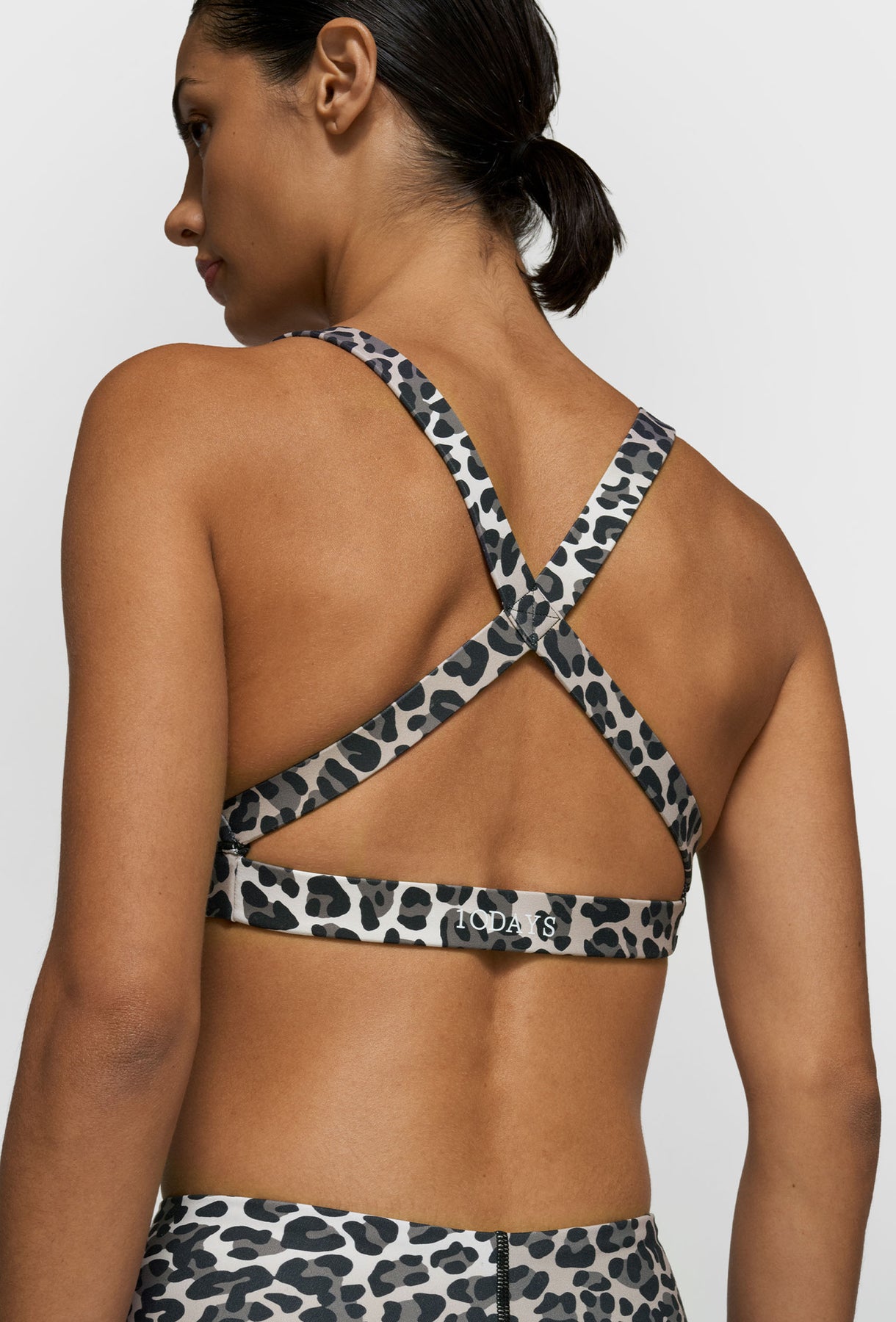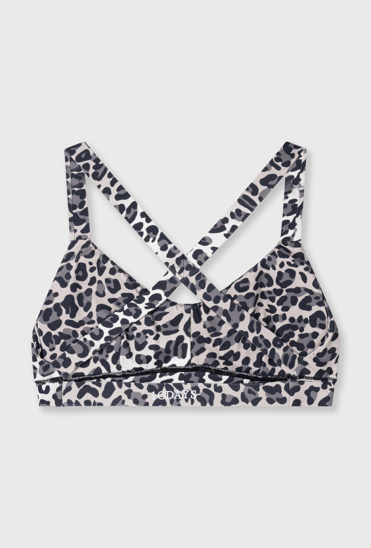 Profesjonalny stanik sportowy o dynamicznym kroju, wzbogacony wyrazistym, monochromatycznym wzorem w panterkę (lub: cętki). Ten model łączy maksymalne wsparcie ze stylowym, fashion-forward designem, idealnym na intensywny trening i jogę. Stanik wykonany jest z elastycznego, technicznego materiału, który zapewnia doskonałe odprowadzanie wilgoci i komfort noszenia nawet podczas najbardziej wymagających ćwiczeń. Wzór w panterkę utrzymany jest w neutralnych odcieniach szarości, bieli i czerni. Charakterystycznym elementem jest krzyżujący się na plecach układ szerokich ramiączek (crossback), który gwarantuje idealne dopasowanie i stabilne wsparcie bez ograniczania ruchów. Szeroki, elastyczny pas pod biustem zapewnia dodatkowe trzymanie, a na jego środku, z tyłu, widoczne jest kontrastowe logo 10DAYS. Dzięki swojemu designowi, ten stanik sportowy doskonale sprawdzi się jako samodzielny top lub jako element stylowego zestawu treningowego, stanowiąc motywujący i modny akcent aktywnych zestawów.