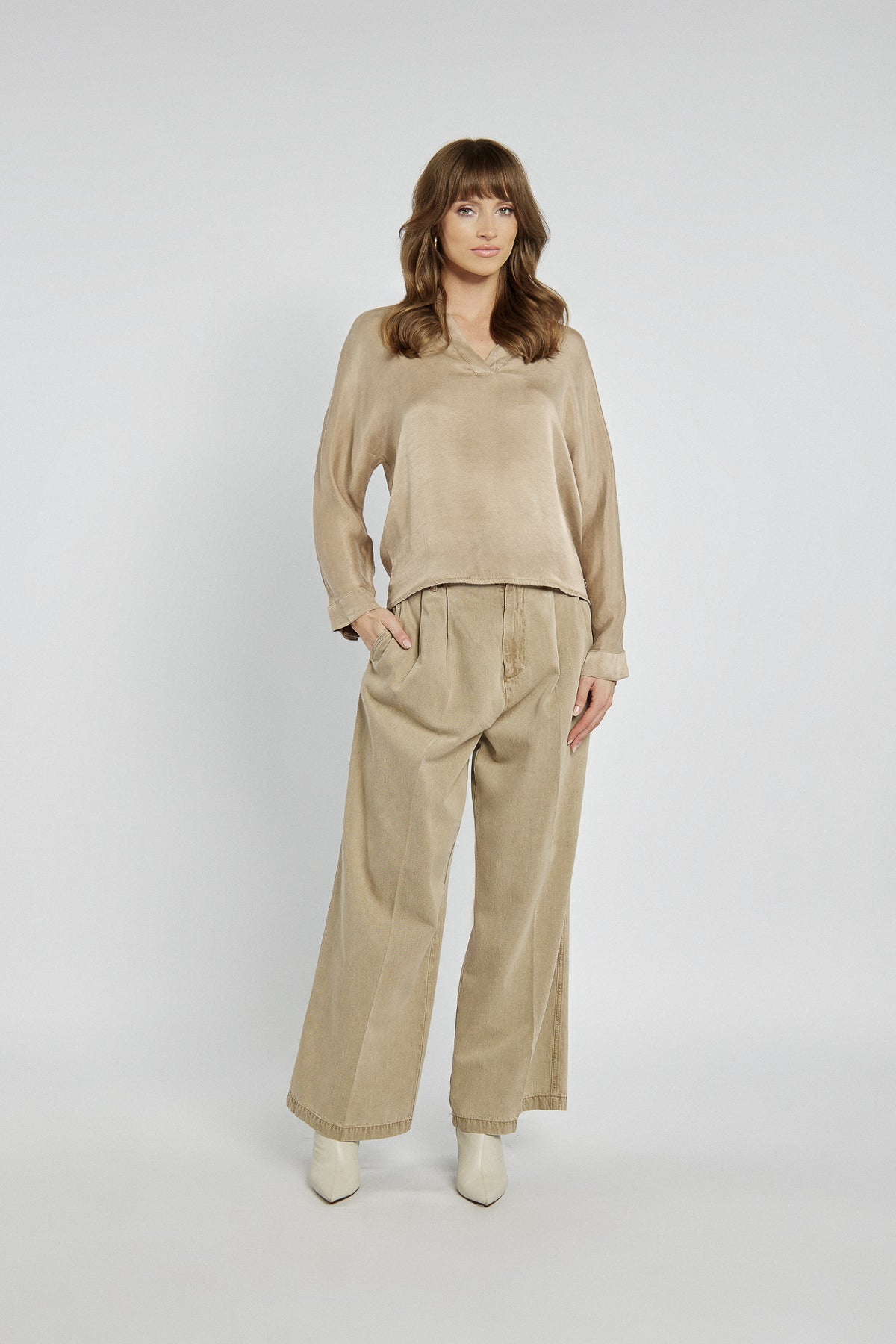 Beżowa bluzka Campione wykonana z tkaniny o delikatnym, satynowym połysku to propozycja dla kobiet ceniących subtelny szyk. Model z luźniejszym krojem, długim rękawem i niewielkim kołnierzykiem podkreśla swobodny, a jednocześnie elegancki charakter. Idealna do zestawień zarówno z klasycznymi spodniami, jak i spódnicą.