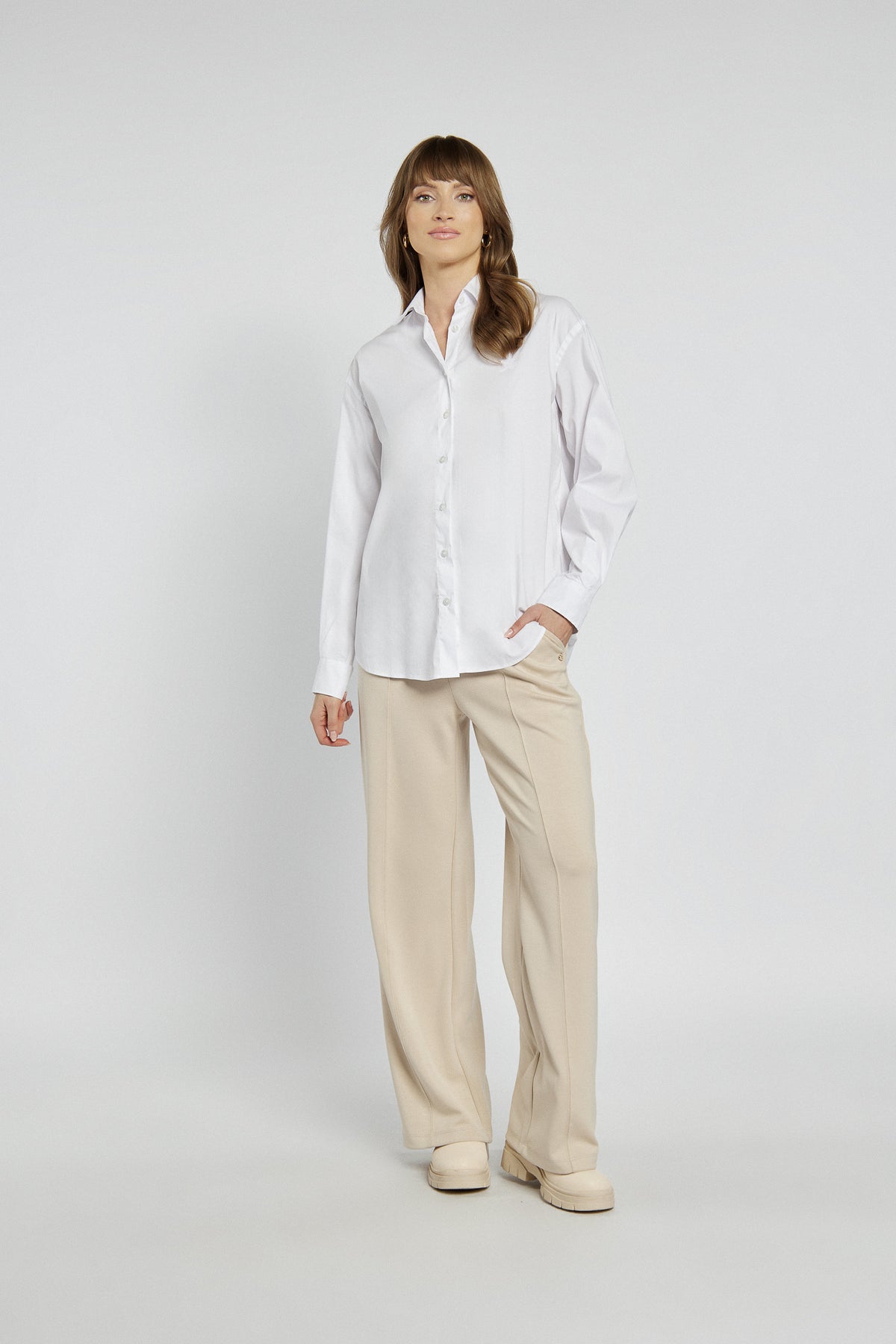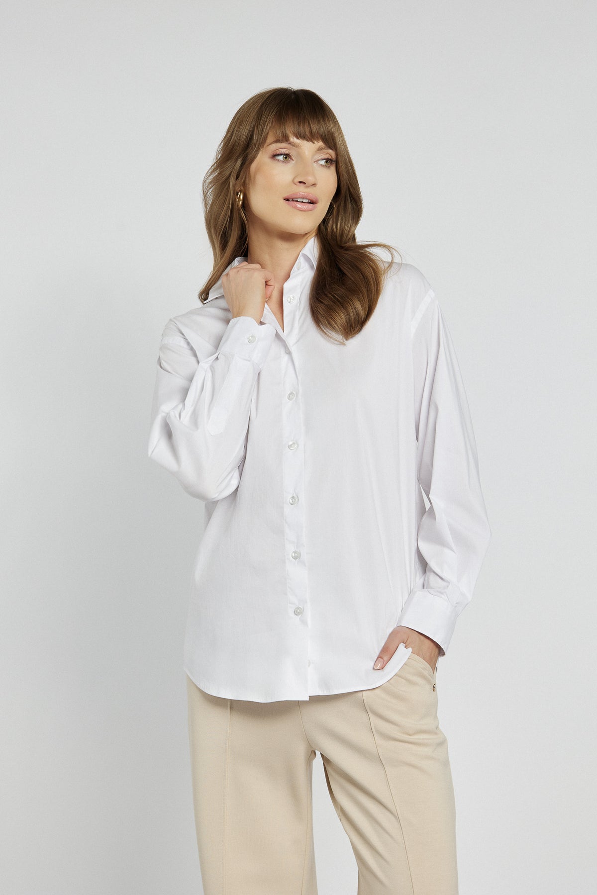 Koszula Campione w ponadczasowej bieli to kwintesencja klasy i uniwersalności. Wykonana z wysokiej jakości tkaniny, zapewnia komfort noszenia oraz świetne dopasowanie. Klasyczny kołnierzyk, długi rękaw zakończony mankietem na guzik i eleganckie perłowe zapięcia czynią ten model idealnym wyborem do biura, na spotkania czy codzienne stylizacje. Lekko luźny fason nadaje jej swobodnego, ale dopracowanego wyglądu.