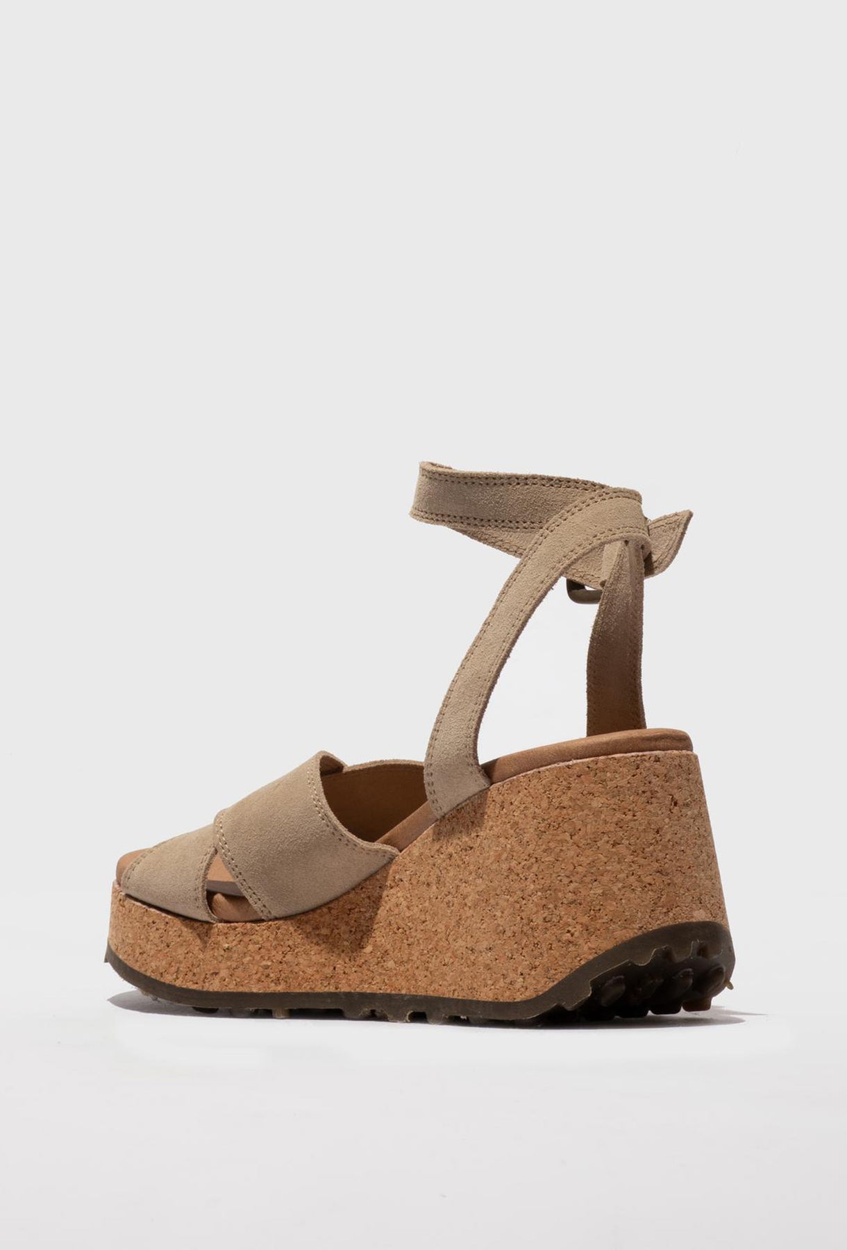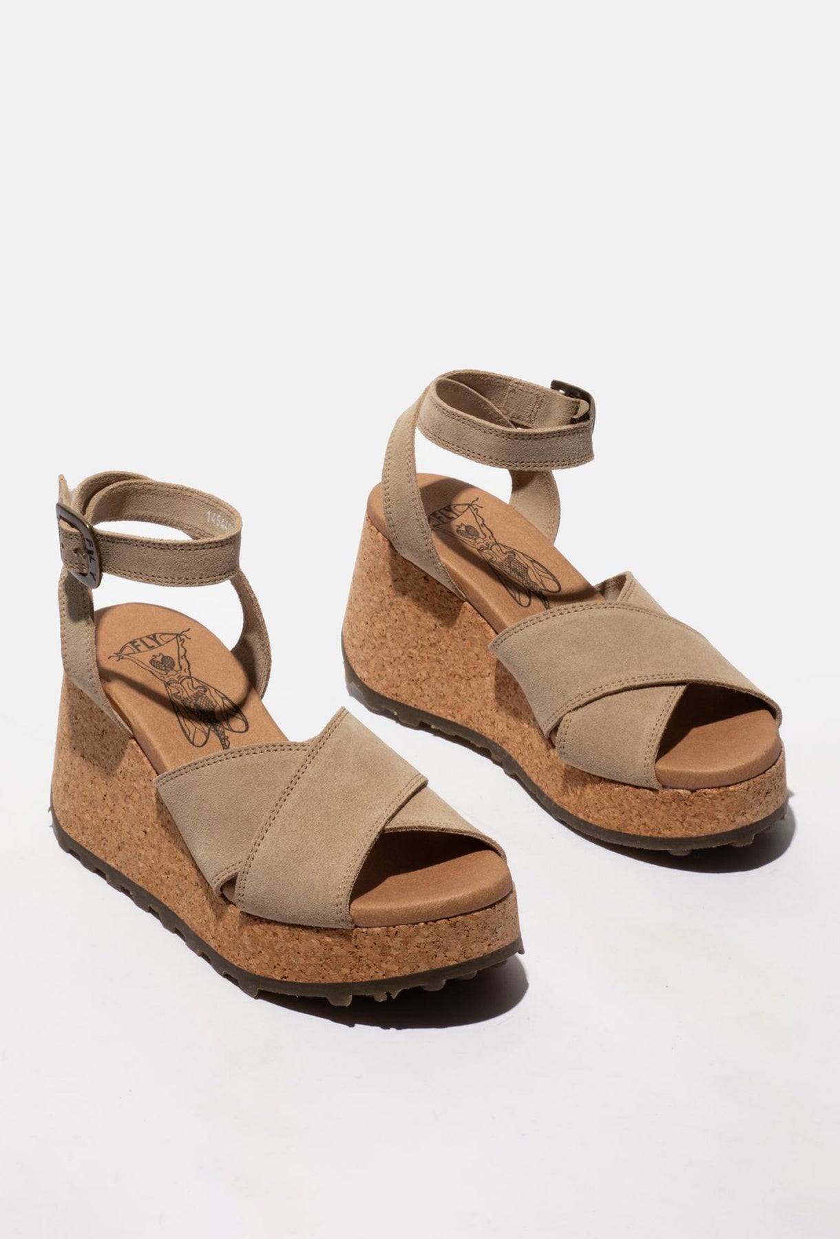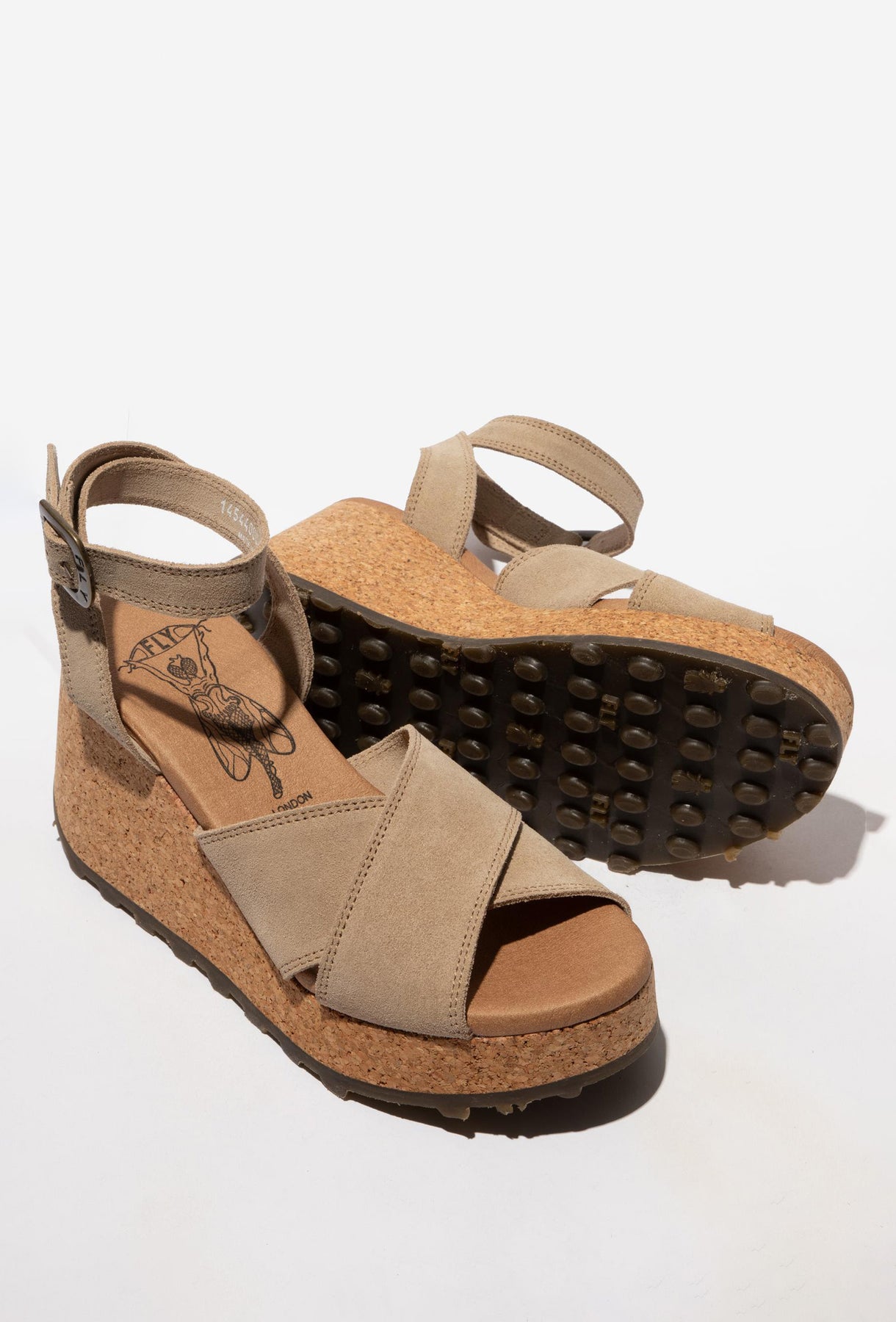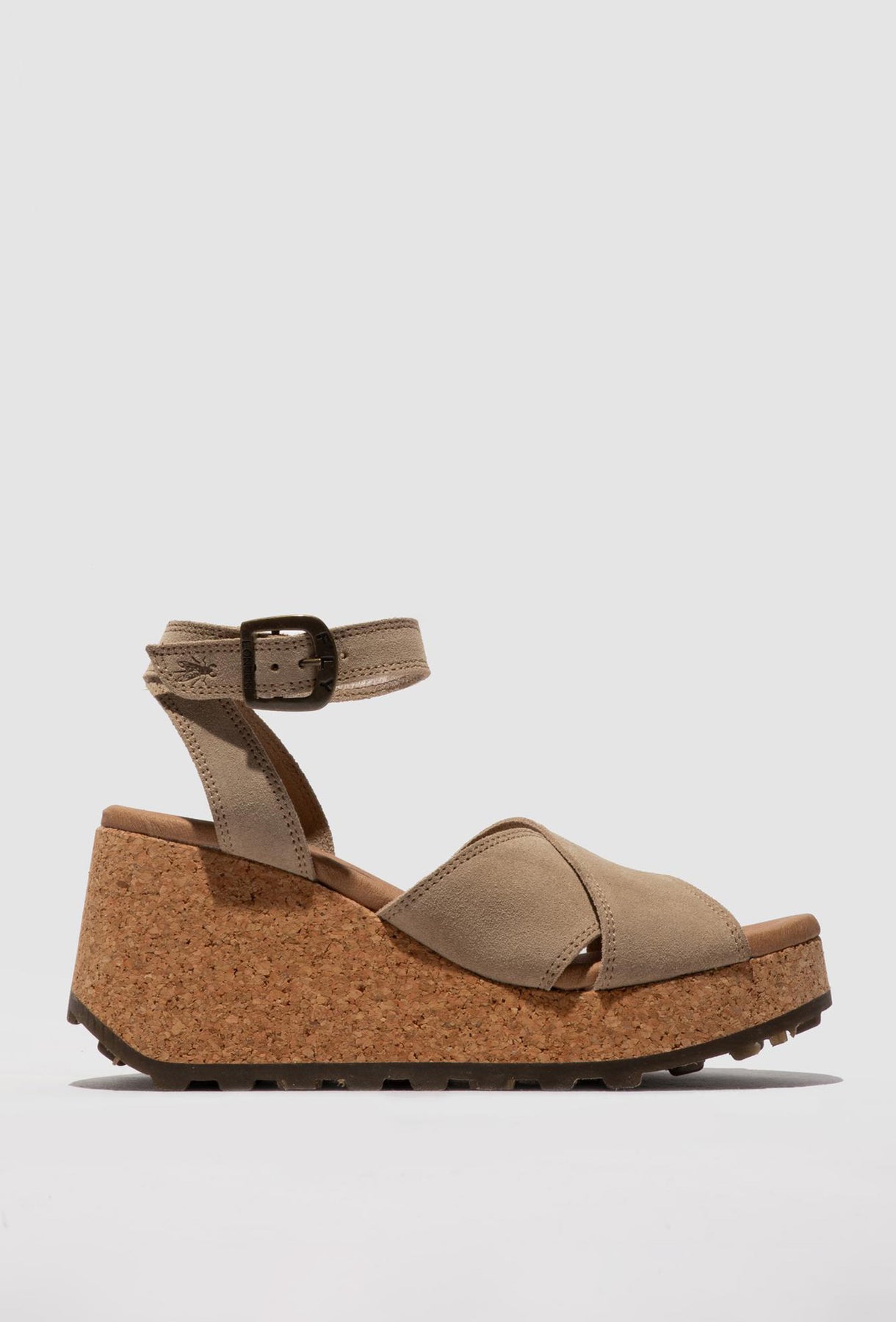 Te wyjątkowe sandały na wysokiej platformie od FLY LONDON to esencja letniego stylu i niezrównanej wygody. Cholewka wykonana z luksusowego zamszu w odcieniu taupe charakteryzuje się szerokimi, krzyżującymi się pasami, które miękko otulają stopę. Kluczowym elementem modelu jest efektowna podeszwa wykonana z naturalnego korka, która mimo swojej wysokości pozostaje lekka i zapewnia doskonałą amortyzację. Gumowy spód z charakterystycznymi wypustkami gwarantuje przyczepność i trwałość obuwia. Komfort podnosi skórzana wkładka z autorską grafiką oraz regulowany pasek z klamrą na wysokości kostki. Sandały te świetnie wysmuklają sylwetkę, będąc doskonałym wyborem do stylizacji boho, lnianych spodni czy letnich sukienek maxi.