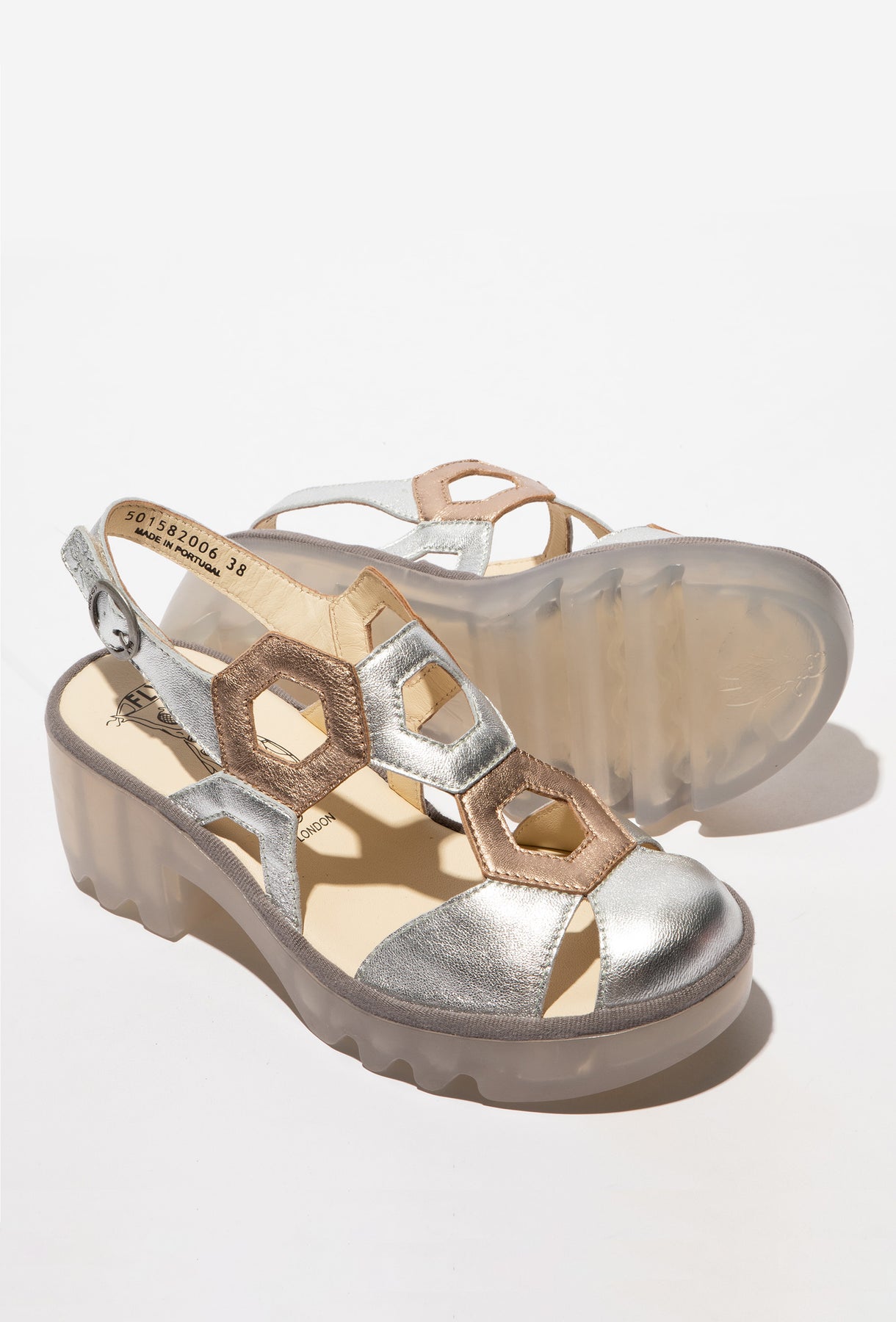 Te futurystyczne sandały marki FLY LONDON to propozycja dla kobiet, które kochają błysk i nieszablonowe rozwiązania. Cholewka wykonana z metalicznej skóry w odcieniach srebra i różowego złota przyciąga uwagę unikatowymi, sześciokątnymi wycięciami, tworzącymi ażurowy wzór na stopie. Model osadzony jest na charakterystycznej dla marki, półtransparentnej podeszwie z grubym bieżnikiem, która zapewnia doskonałą amortyzację i nowoczesny wygląd. Stabilna platforma oraz regulowany pasek na pięcie gwarantują wygodę nawet podczas wielogodzinnego użytkowania. Wnętrze buta wykończone jest miękką skórą z logowaniem, co potwierdza autentyczność tego modelu z linii premium. Te sandały będą doskonałym akcentem w minimalistycznych, miejskich zestawach.