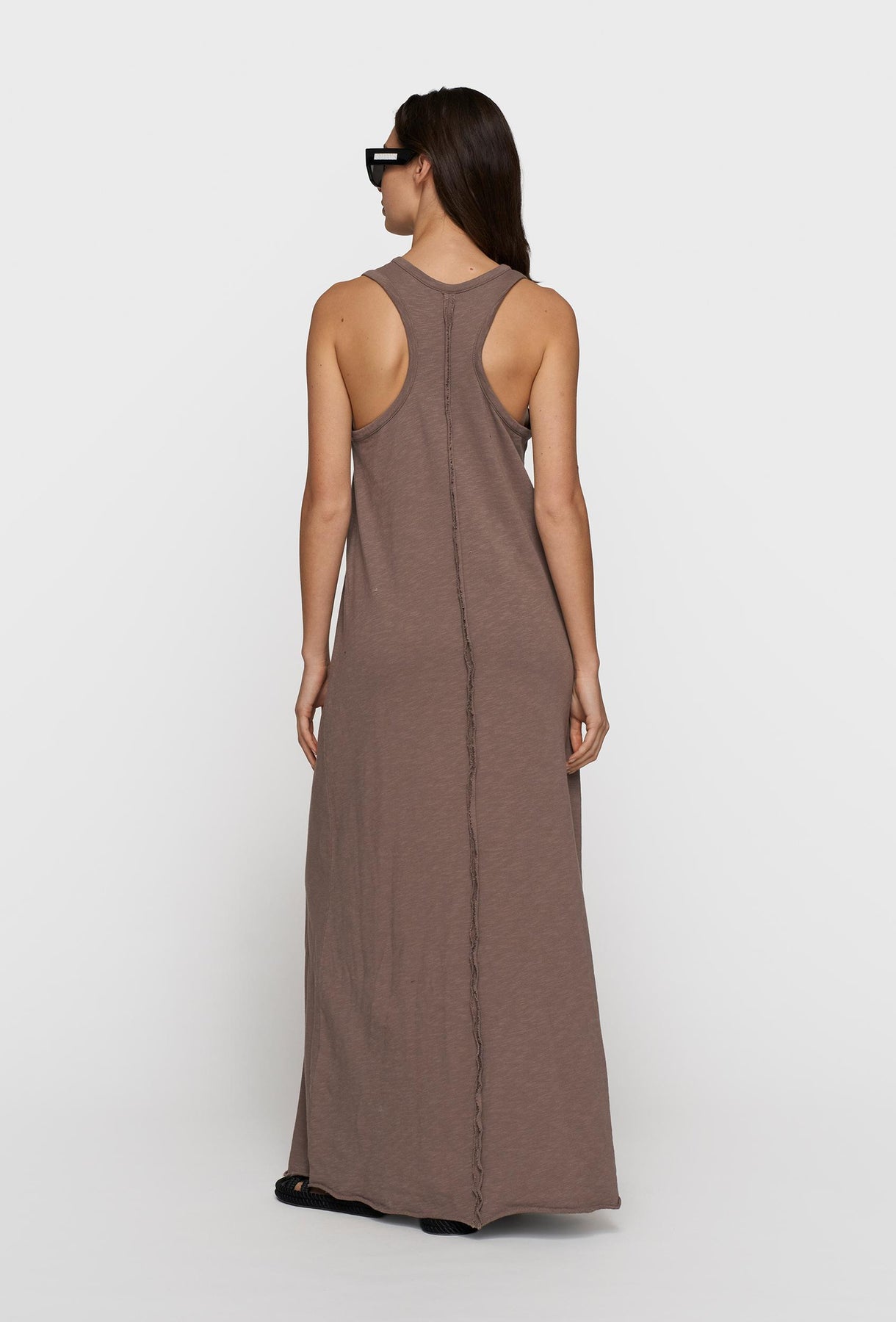 Minimalistyczna sukienka maxi w odcieniu taupe to połączenie wygody i nowoczesnej prostoty. Wykonana z miękkiej, przyjemnej dla skóry dzianiny o delikatnej strukturze, idealnie dopasowuje się do sylwetki, jednocześnie zapewniając swobodę ruchów. Fason typu tank z głębiej wyciętymi ramionami i zaokrąglonym dekoltem nadaje całości sportowo-eleganckiego charakteru. Dopasowana góra subtelnie podkreśla figurę, a lekko rozszerzany dół pięknie układa się w ruchu, tworząc wydłużoną, smukłą linię. Uniwersalny kolor sprawia, że sukienka świetnie komponuje się zarówno z casualowymi dodatkami, jak i bardziej wyrazistymi akcentami. Idealna na co dzień, w podróży lub na letnie spacery – komfortowa, stylowa i ponadczasowa.