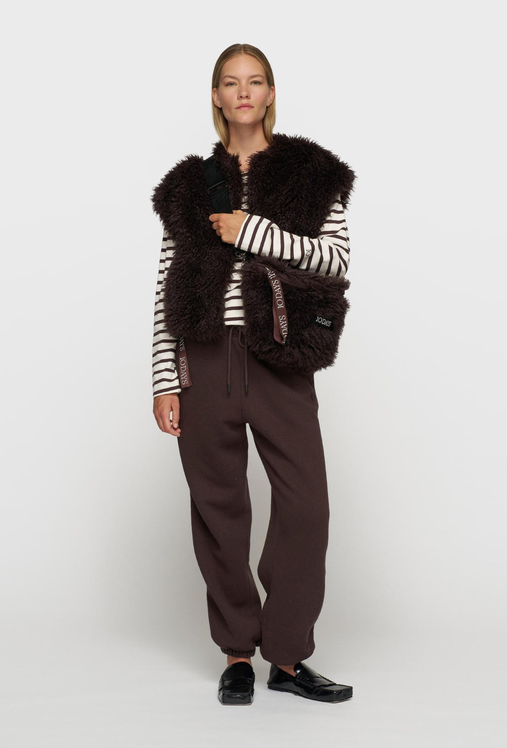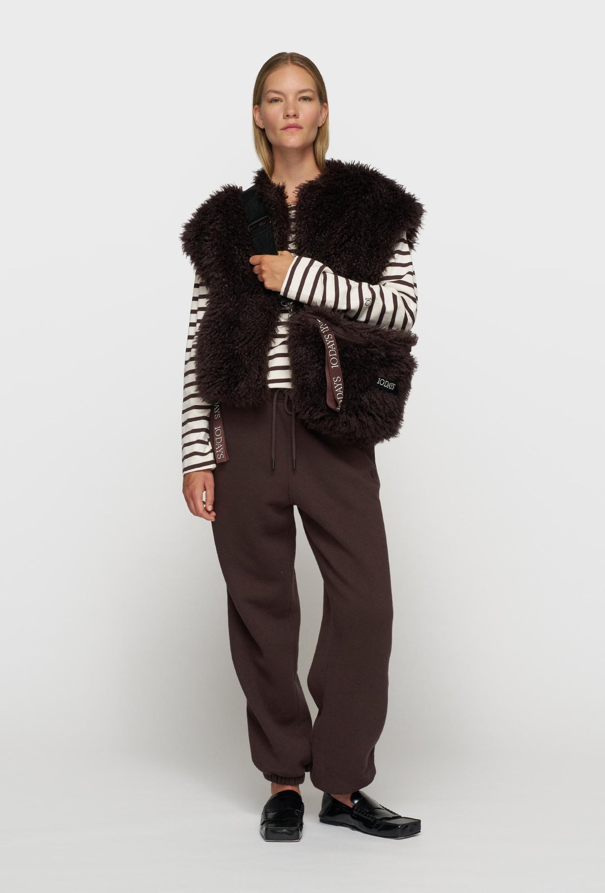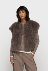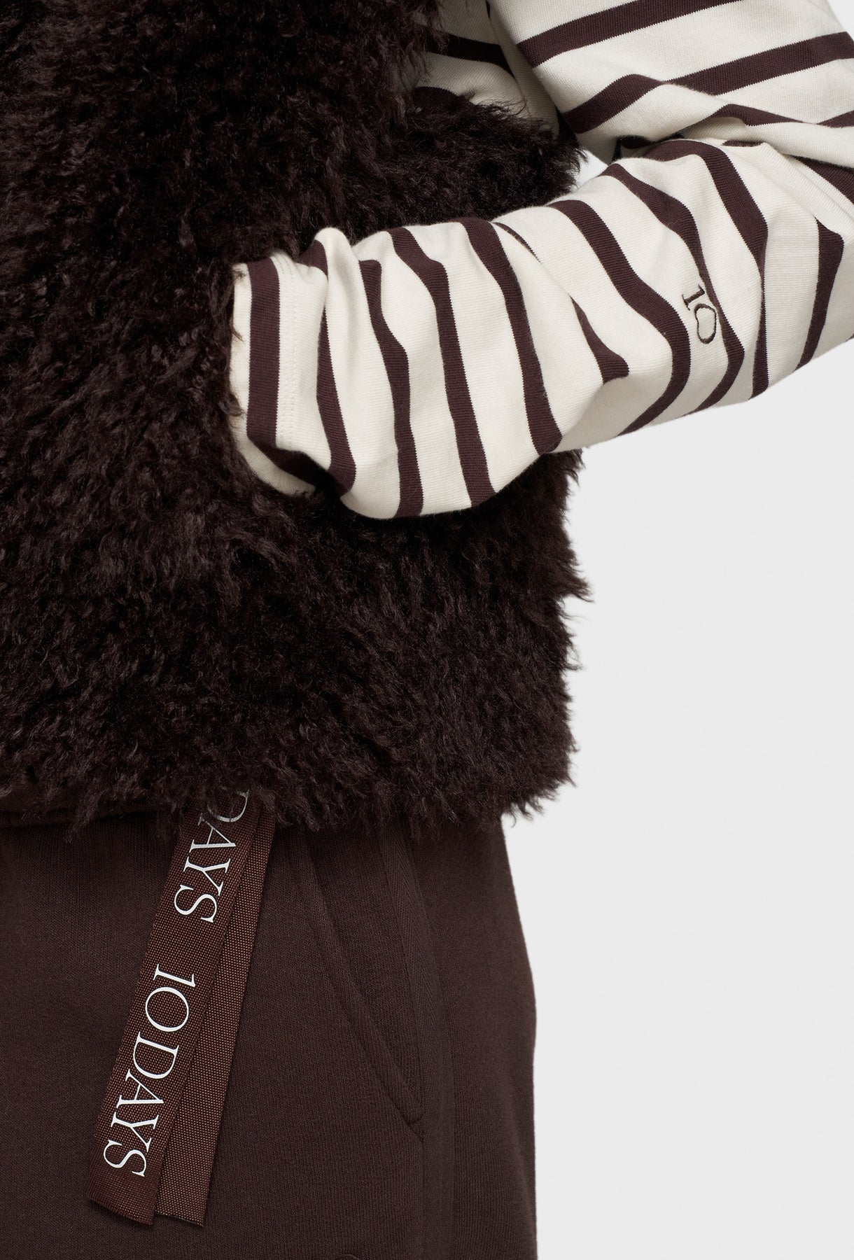 Krótka puchata kamizelka ze sztucznego futra w głębokim brązie