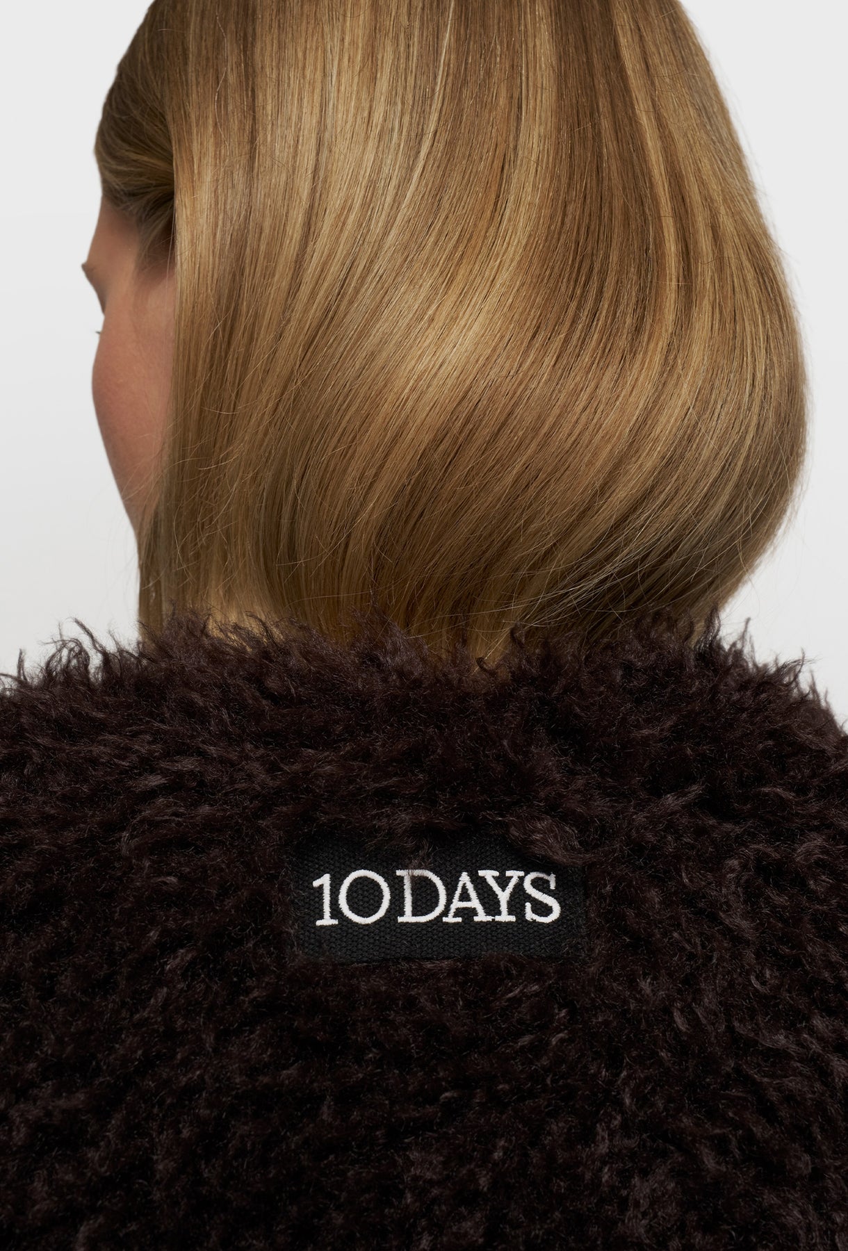 Ta krótka kamizelka wykonana z miękkiego, puszystego sztucznego futra w głębokim, czekoladowym odcieniu brązu to idealny dodatek do warstwowych, jesienno-zimowych stylizacji. Charakteryzuje się luźnym krojem bez rękawów i z dekoltem w kształcie litery V (lub okrągłym, w zależności od ułożenia włosia), który doskonale sprawdzi się nałożony na longsleeve, sweter lub sukienkę. Materiał o wyraźnej teksturze i długim włosiu zapewnia ciepło i nadaje stylizacji wyrazistego, luksusowego charakteru. Kamizelka jest krótka, sięgająca bioder, co pozwala na ciekawe proporcje. Z tyłu u dołu znajdują się ozdobne długie taśmy, które dodają współczesnego, casualowego akcentu. To odważny i modny element, który natychmiast urozmaici każdą bazową odzież.