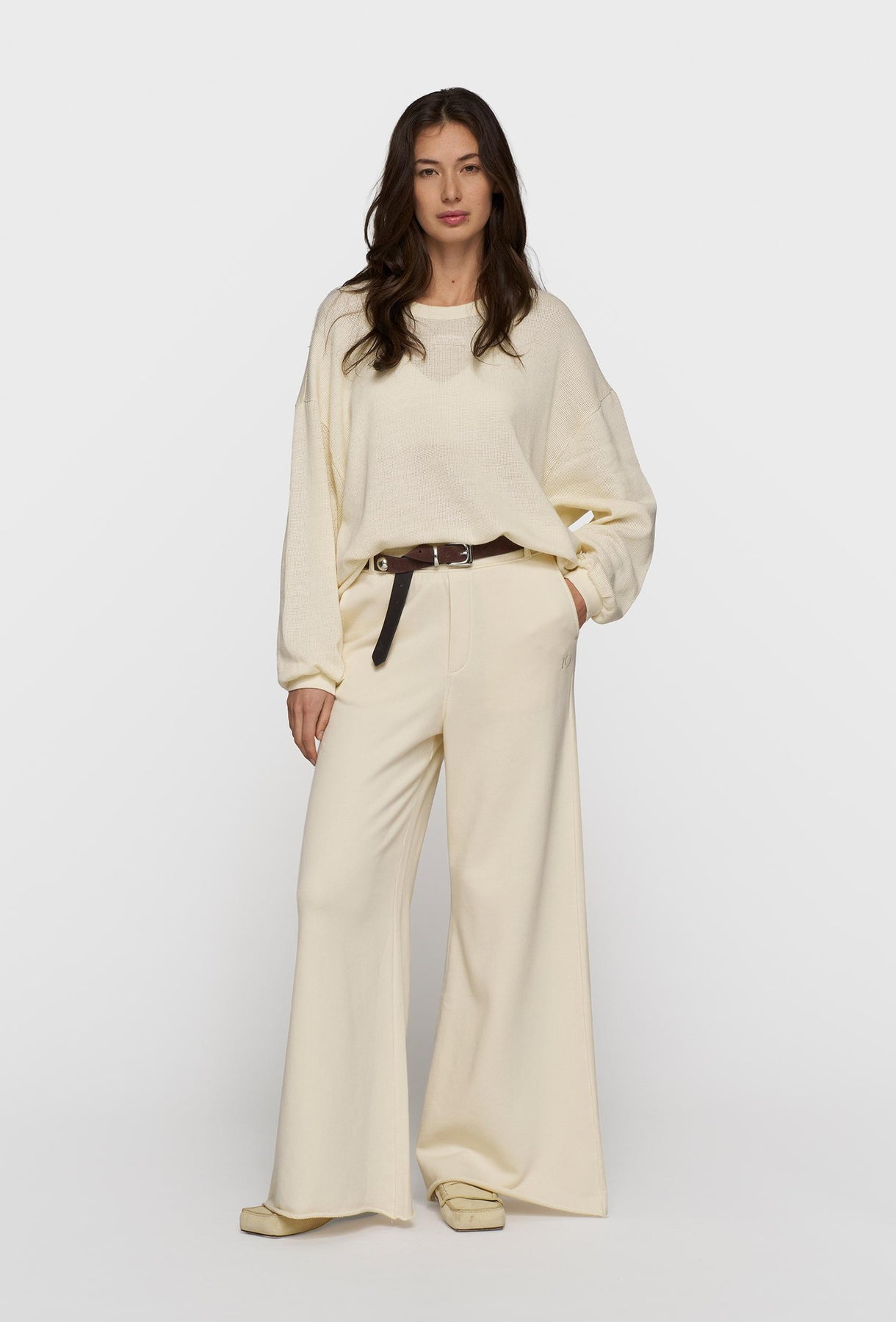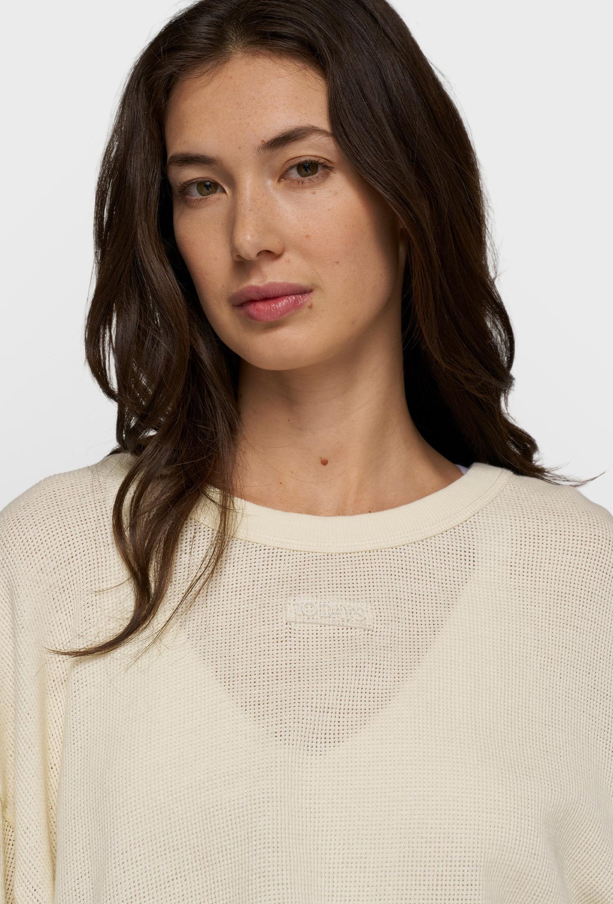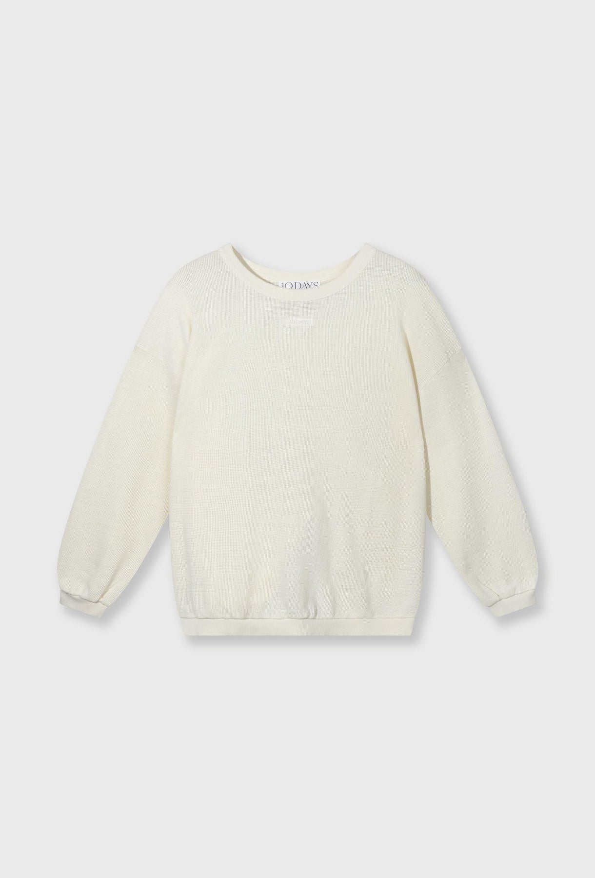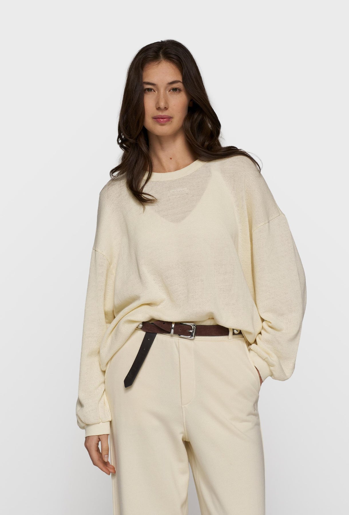 Lekka bluza z przewiewnej, siateczkowej dzianiny w subtelnym kolorze ecru. Luźny, swobodny fason z obniżoną linią ramion zapewnia komfort noszenia i nadaje całości nowoczesny, nonszalancki charakter. Model wyróżnia się delikatnie transparentną strukturą, klasycznym okrągłym dekoltem oraz ściągaczami przy mankietach i u dołu, które porządkują sylwetkę i podkreślają sportowo-casualowy styl. Minimalistyczne logo na piersi dopełnia projekt w dyskretny sposób. Świetnie sprawdzi się w codziennych stylizacjach – noś ją z topem, T-shirtem lub lekkim biustonoszem, zestawiając z jeansami, szortami albo spodniami o luźnym kroju.