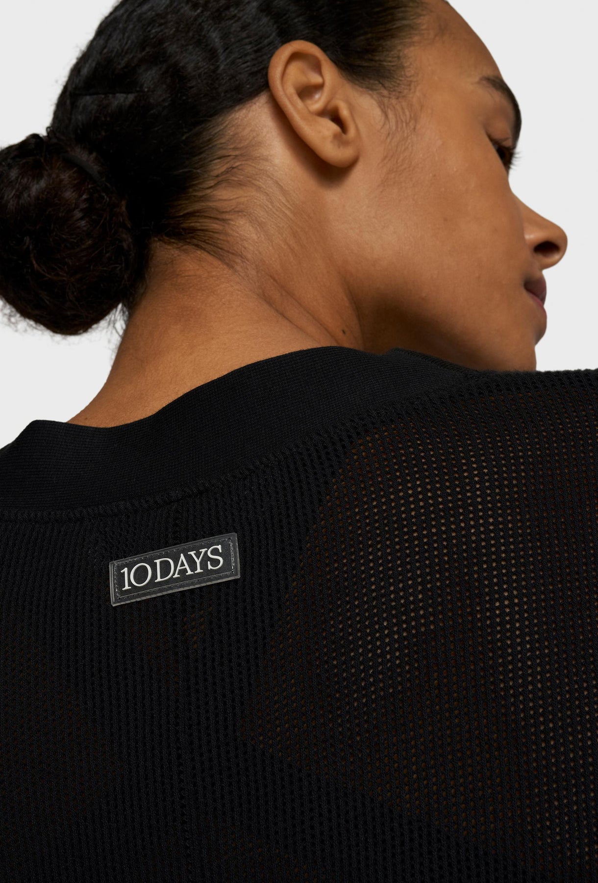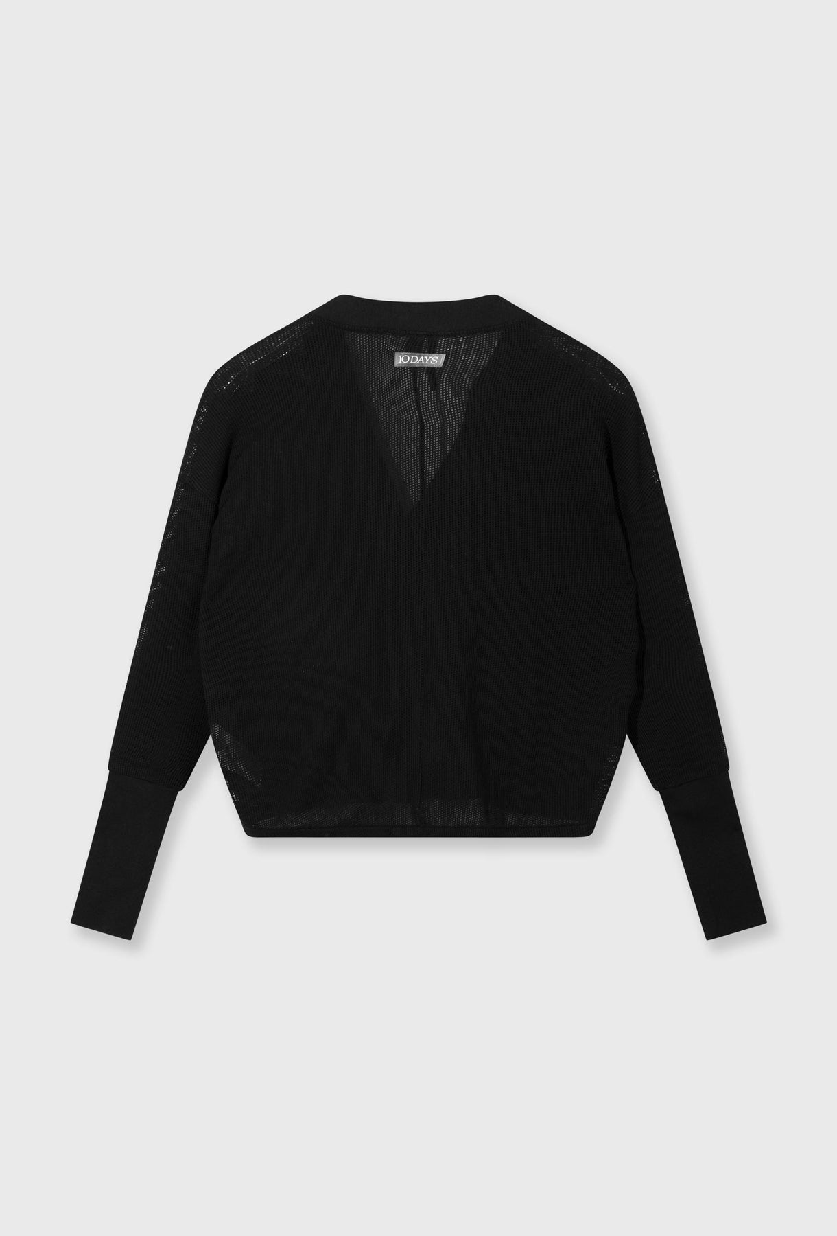 Lekki kardigan w kolorze czarnym wykonany z ażurowej, przewiewnej dzianiny. Model o luźnym fasonie z głębokim dekoltem w kształcie litery V zapinany na duże guziki, który nadaje całości swobodnego, nowoczesnego charakteru. Delikatna, siateczkowa struktura materiału sprawia, że kardigan jest lekki i doskonale sprawdzi się jako warstwa na top, T-shirt lub sukienkę. Obniżona linia ramion oraz długie rękawy zakończone szerokimi mankietami podkreślają casualowy styl modelu. Krótszy przód i lekko zaokrąglony dół zapewniają dobre układanie się na sylwetce.