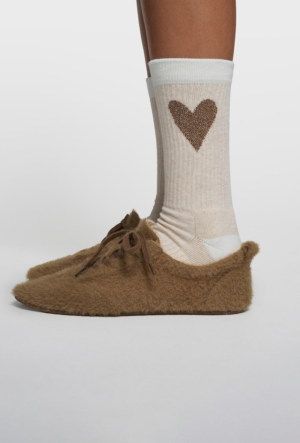 Delikatne, beżowe skarpetki marki 10DAYS to połączenie subtelnej elegancji z modnym, kobiecym akcentem. Wykonane z miękkiej, przyjemnej w dotyku dzianiny, zapewniają wysoki komfort noszenia i doskonałe dopasowanie do stopy przez cały dzień. Model wyróżnia się efektownym, połyskującym motywem serca w ciepłym, brązowym odcieniu, który nadaje całości wyjątkowego charakteru i lekko biżuteryjnego wyrazu. Jasny, neutralny kolor sprawia, że skarpetki łatwo dopasować do wielu stylizacji — od casualowych po bardziej dopracowane zestawy. Klasyczna długość do połowy łydki sprawia, że świetnie prezentują się zarówno ze sneakersami, jak i botkami czy mokasynami. To stylowy detal, który podkreśli indywidualny charakter stylizacji i doda jej subtelnego uroku. Idealne dla osób, które cenią komfort, jakość oraz modne, ale nienachalne dodatki.