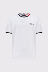 Klasyczny biały T-shirt męski marki Campione to baza każdej letniej garderoby w stylu premium. Koszulka wyróżnia się unikatowym wykończeniem dekoltu oraz rękawów w formie elastycznego ściągacza w kolorach granatowym i czerwonym. Na lewej piersi umieszczono minimalistyczny, czarny nadruk Marine Club Campione, który podkreśla markowy charakter produktu. Wykonany z miękkiej i oddychającej bawełny, T-shirt gwarantuje wygodę przez cały dzień. To idealna propozycja do jeansów lub sportowych spodni dresowych.