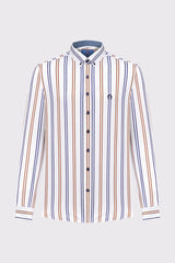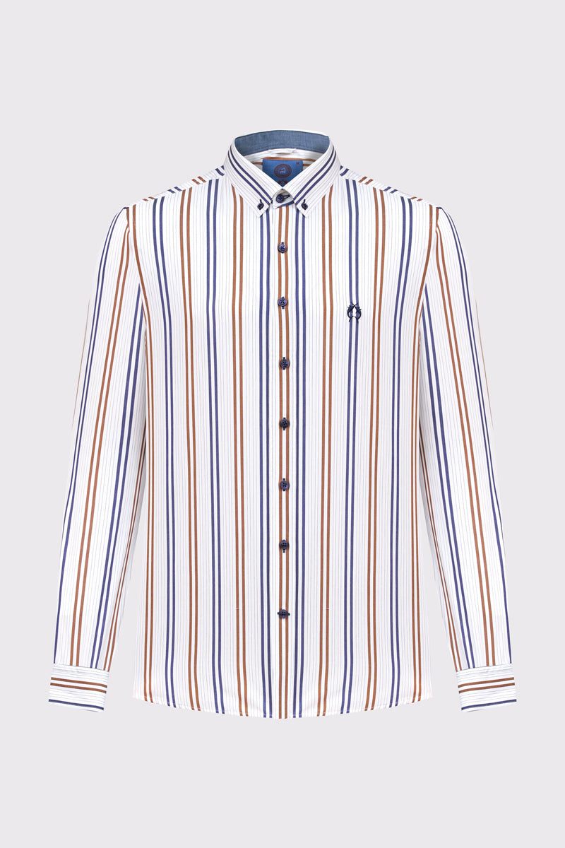 Stylowa męska koszula marki Campione, wykonana z wysokiej jakości tkaniny o wyraźnej strukturze. Model wyróżnia się klasycznym wzorem w pionowe pasy w kolorach niebieskim i brązowym na jasnym tle, co nadaje sylwetce lekkości. Koszula posiada długi rękaw z mankietami zapinanymi na guziki oraz elegancki kołnierzyk typu button-down. Subtelne detale, takie jak haftowane logo na piersi oraz kontrastowe wykończenie wewnętrznej strony stójki, podkreślają jej prestiżowy charakter. Doskonale sprawdzi się w letnich stylizacjach z jasnymi lnianymi spodniami, łącząc elegancję z wakacyjnym luzem.